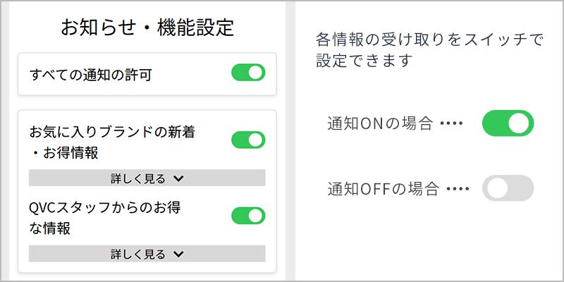 - お気に入りブランドの新着・お得情報や、QVCスタッフからのお得情報それぞれの通知設定を行えます。