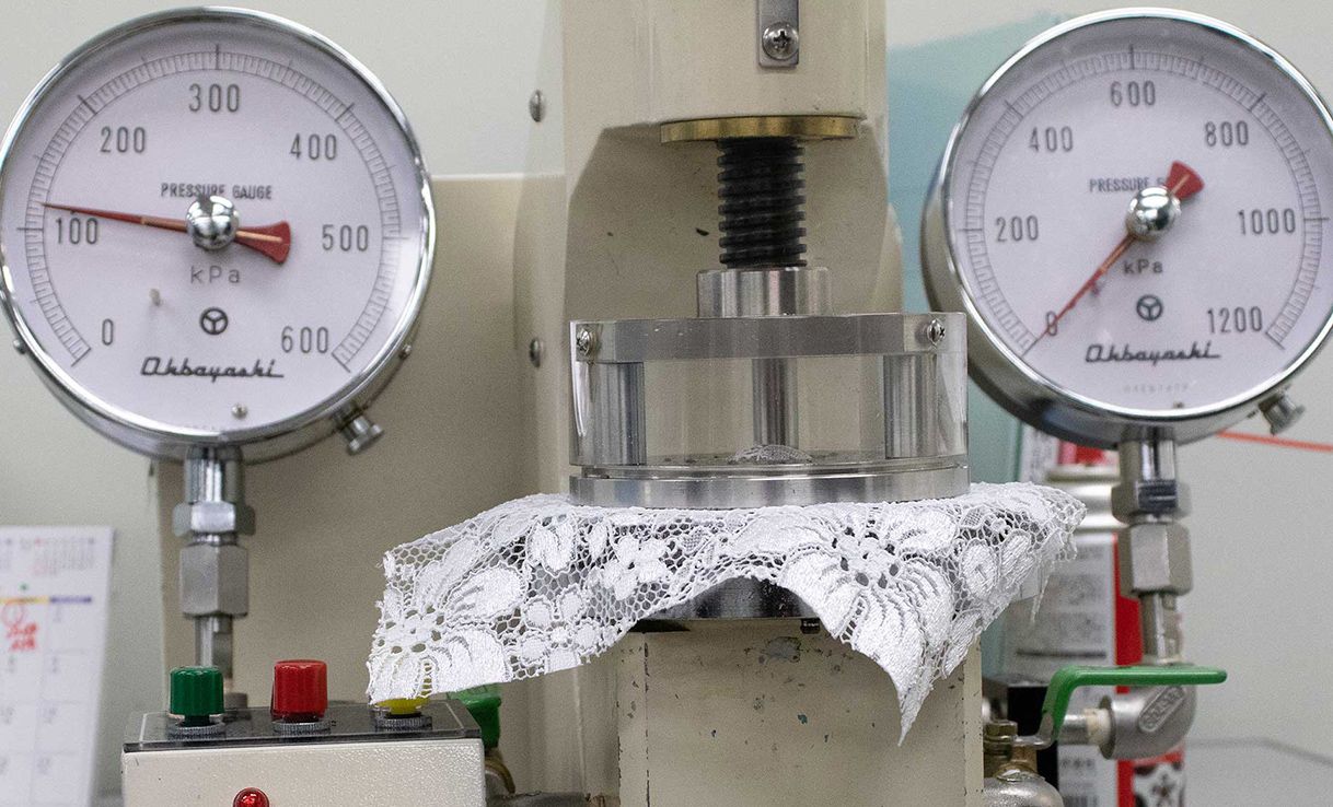 ここで行われているのはレース素材強度の試験。レース生地の中でも一番弱い箇所を基準に強度を測ります。