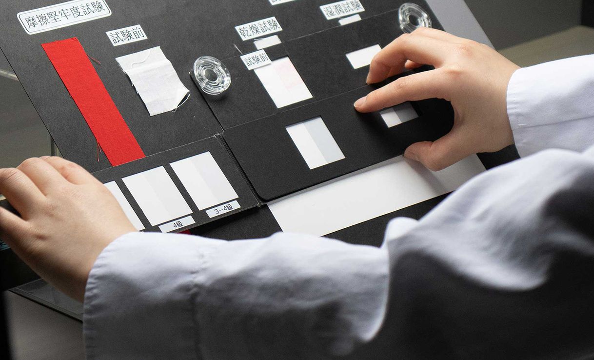 重ね着などの繊維同士のすれ作用によるほかへの色移りの程度をチェックします。