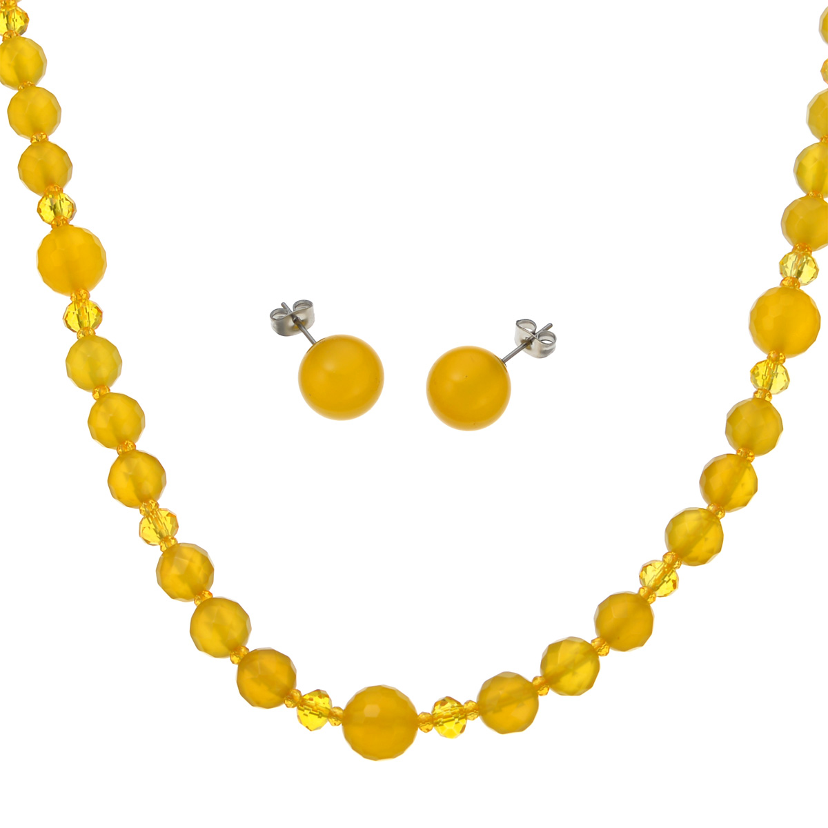 [セット内容] ネックレス、イヤリングまたはピアス 素材:[カルセドニー(イエロー系)(着色)] <ネックレス> 丸珠・多面カット <イヤリング・ピアス> 丸珠 2石 [ガラス] 地金: <ネックレス・イヤリング>真鍮 <ピアス>ステンレス メッキ: <ネックレス>金色メッキ <イヤリング>ロジウムメッキ <ネックレス> 総重量(約):49.0g 長さ(約):79.0〜86.0cm 幅(約):大9.5mm 小2.5mm 留具の形状:ロブスター アジャスターの有無:有 刻印:無 <イヤリング> 縦X横(約):17.5×11.5mm 総重量(約):6.0g 留具の形状:ミックスタイプ 刻印:無 <ピアス> 縦X横(約):11.5×11.5mm 総重量(約):4.0g 留具の形状:ポスト&キャッチ 刻印:無 ■素材の大きさ・形・色合い、製品のサイズは1点1点多少異なります ■サンクスカード付 【中国製】