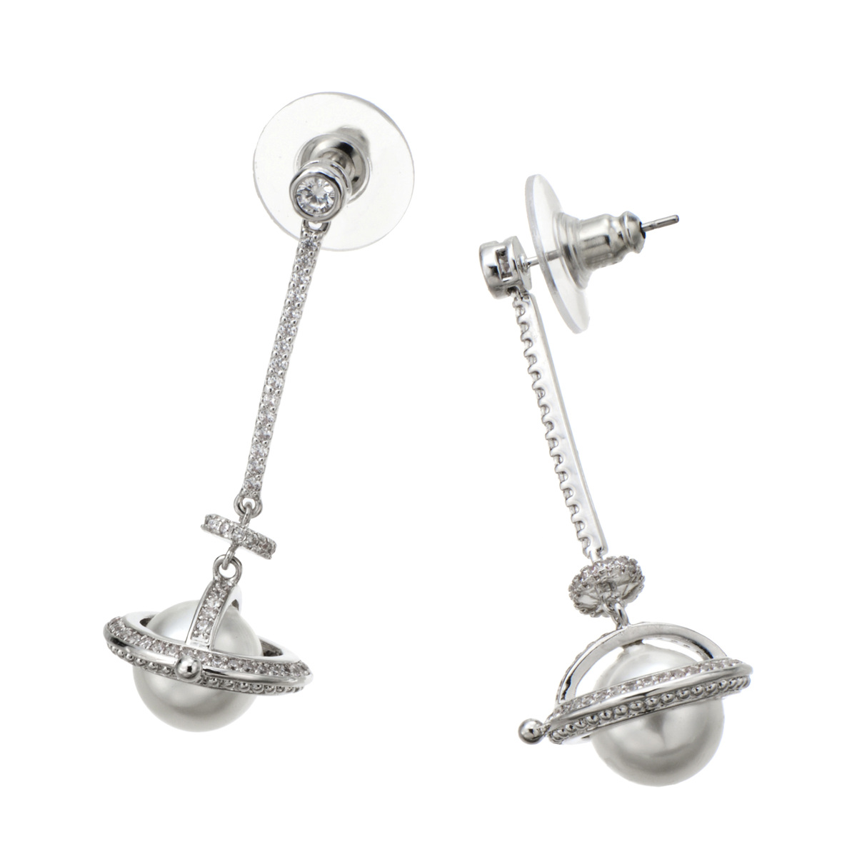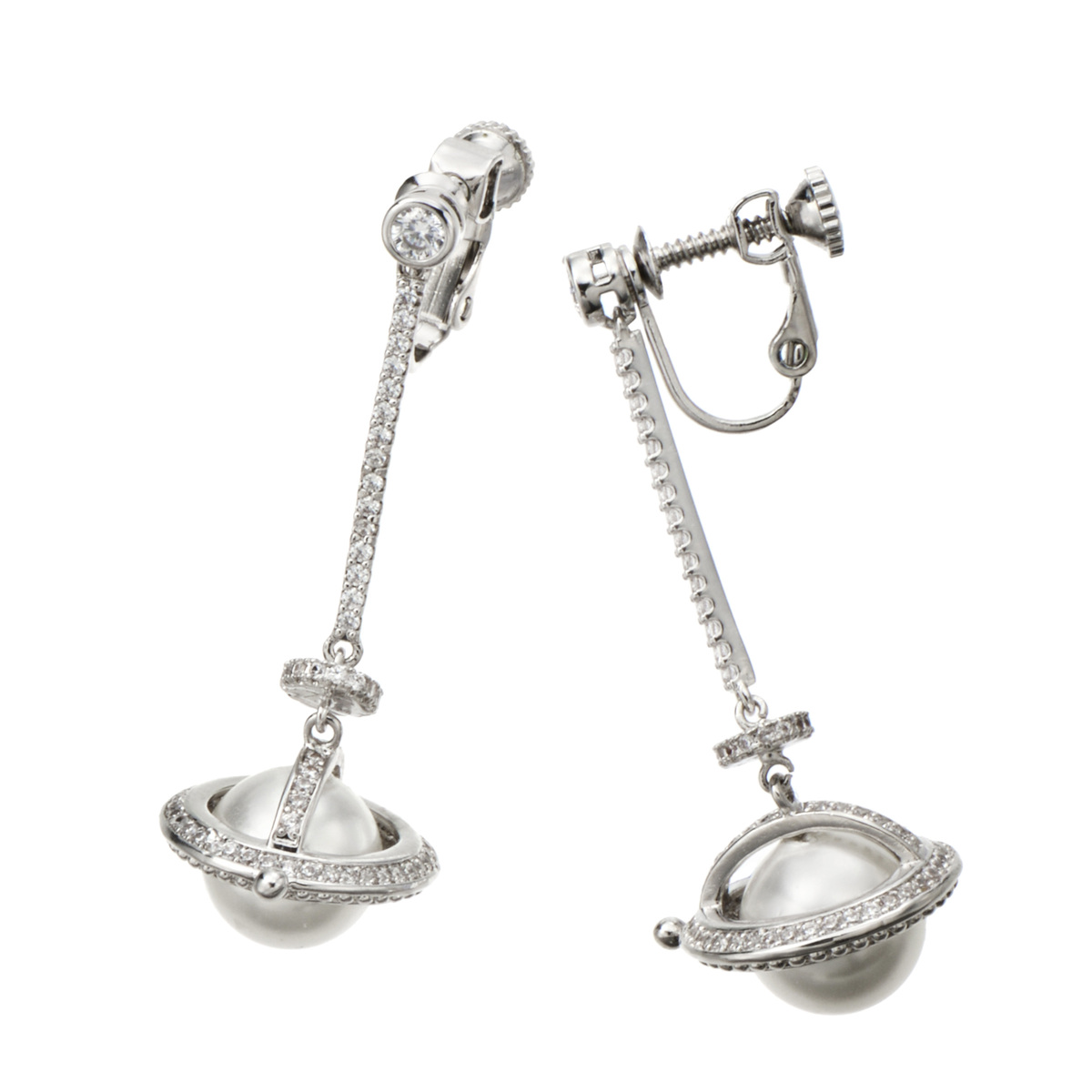 土星をイメージしたプラスチックパールとキュービックジルコニアを組合せた、イヤリングまたはピアスをご紹介。存在感を放ちながらも、上品で女性らしいデザインに仕立てました。カジュアルな普段使いからフォーマルな装いまで、様々なシーンでお使い頂けます。