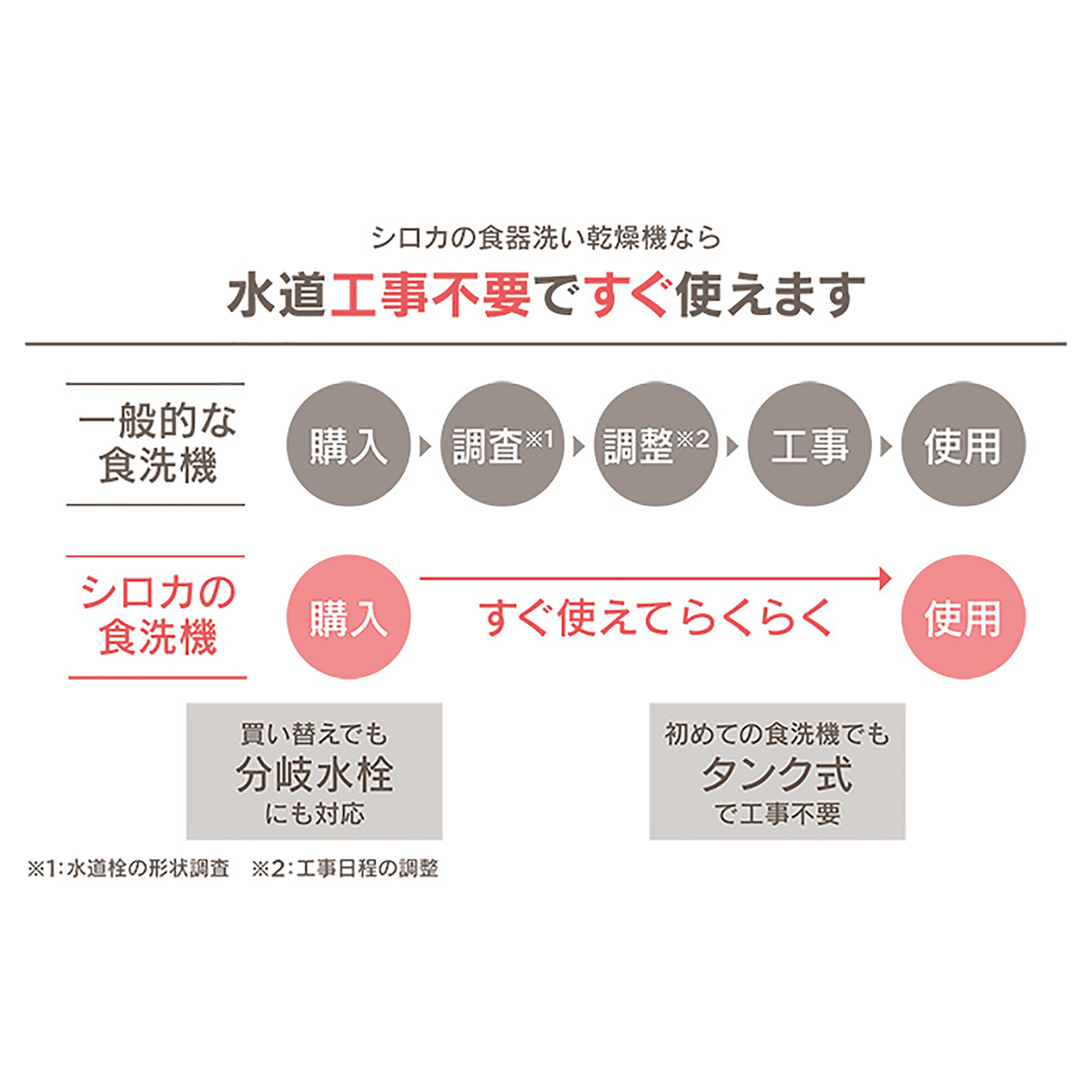 タンク式、分岐水栓のどちらでも使える、2WAYタイプの食器洗い乾燥機です。水道工事が必要なく、届いたその日から使用可能。買い替えで既に分岐水栓がある方も、そのまますぐにお使いいただけます