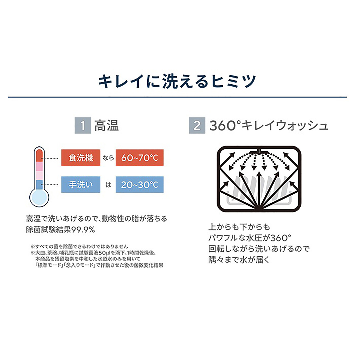360°あらゆる角度からの洗浄ができ、洗い残しがほとんどない、美しい洗い上がりを実現。60℃〜70℃の温度で洗いあげます。また、1回の洗浄に必要な水は約5リットルで、食器16点、小物6点を手洗いした場合の水の量34.9リットル(*1)に比べ、約30リットルも節水できます