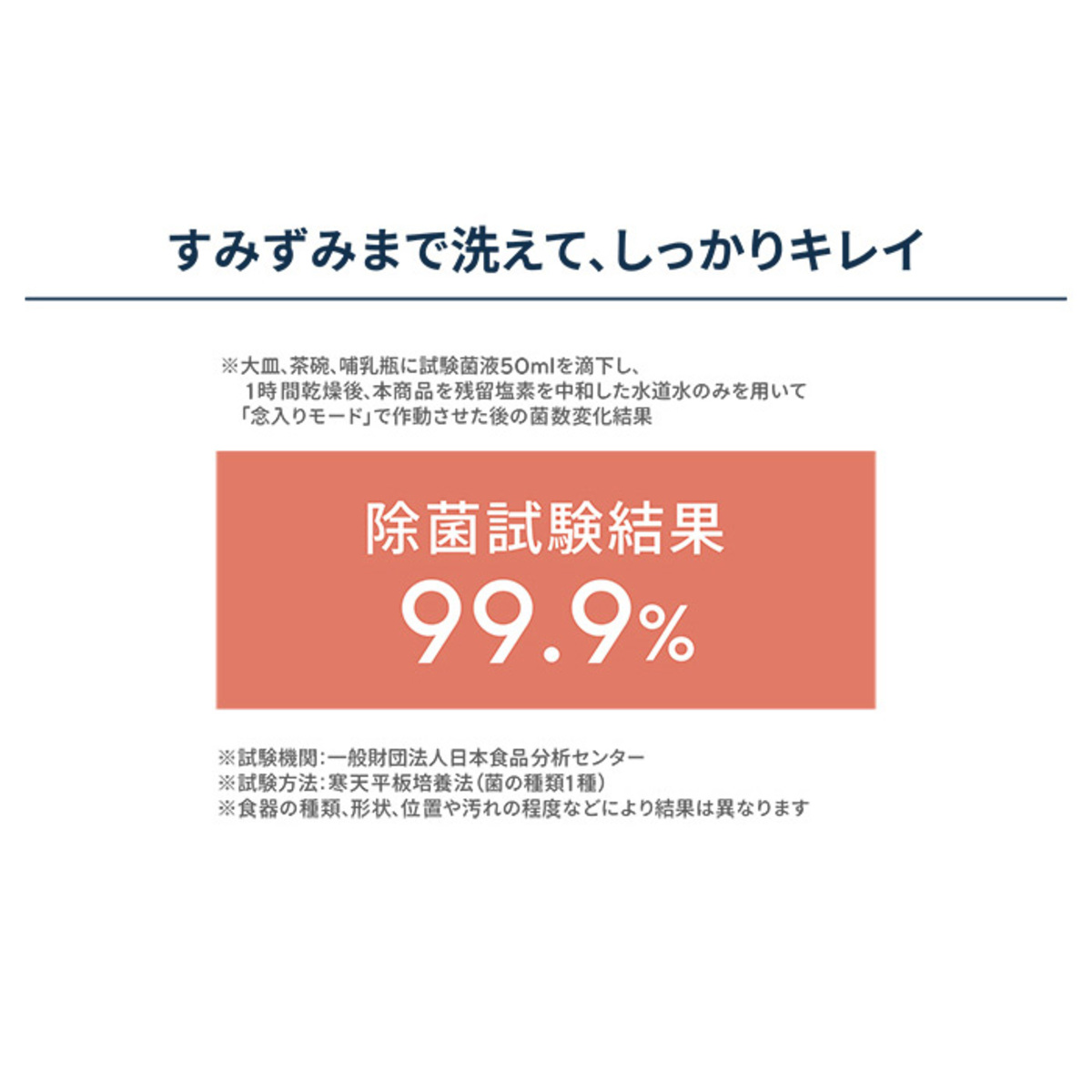 *2)大皿、茶碗、哺乳瓶に試験菌液50mlを滴下し、1時間乾燥後、本商品を残留塩素を希釈した水道水のみを用いて「標準モード」「念入りモード」で作動させた後の菌数変化結果。すべての菌を除去できるわけではありません
