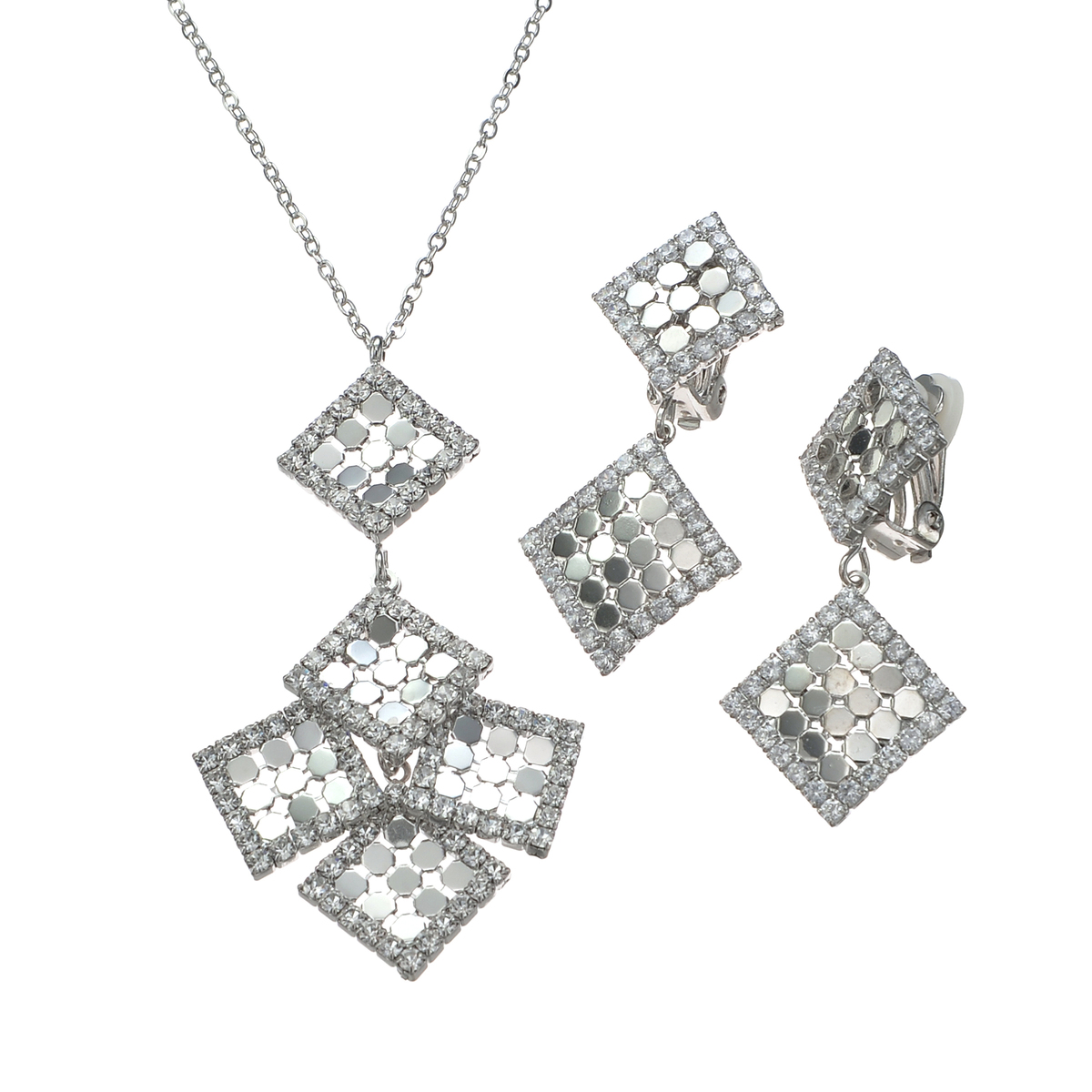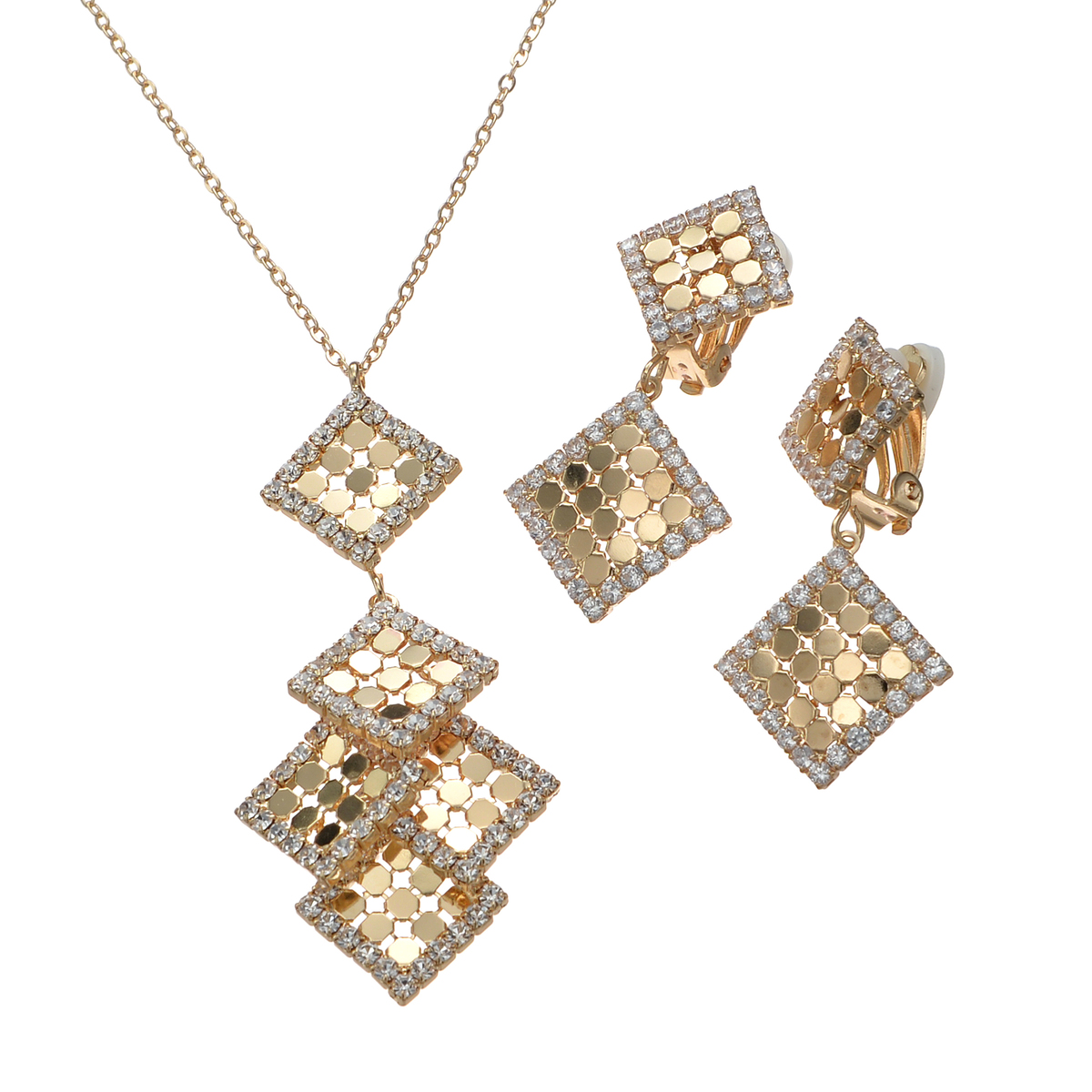 ゴールドを購入しました。金色のスクエアにシルバーの縁取りがしてあって、とっても素敵なネックレス/イヤリングです。スクエアが小さめ、大きすぎないのもいいですね。