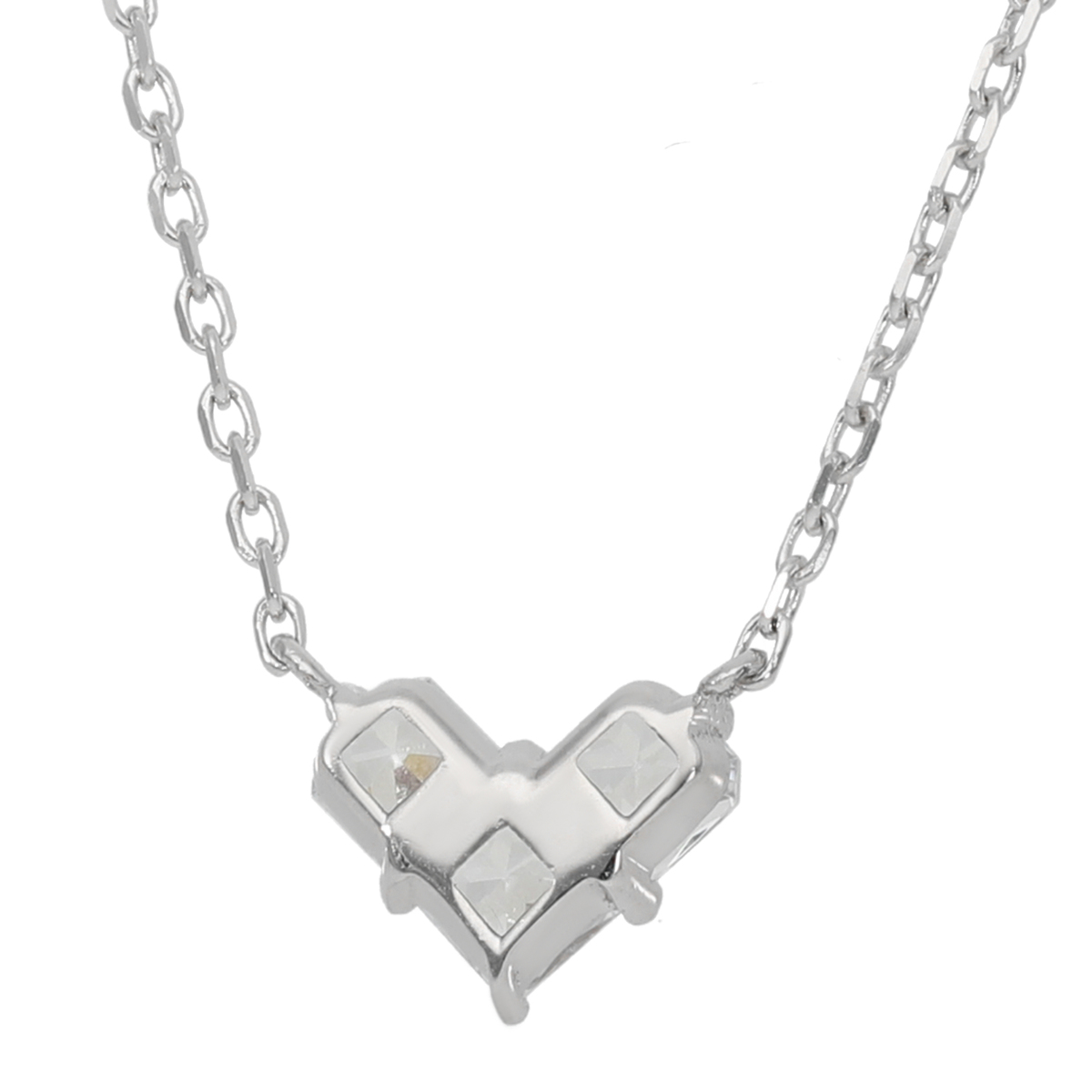 3石のダイヤモニーククリアCZを組合せてハートを模り、ふっくらとした曲線とシャープな直線を合わせ持った甘くなり過ぎないハート型に。胸元にさりげなく煌きを添えてくれるので、デイリー使いにおすすめです