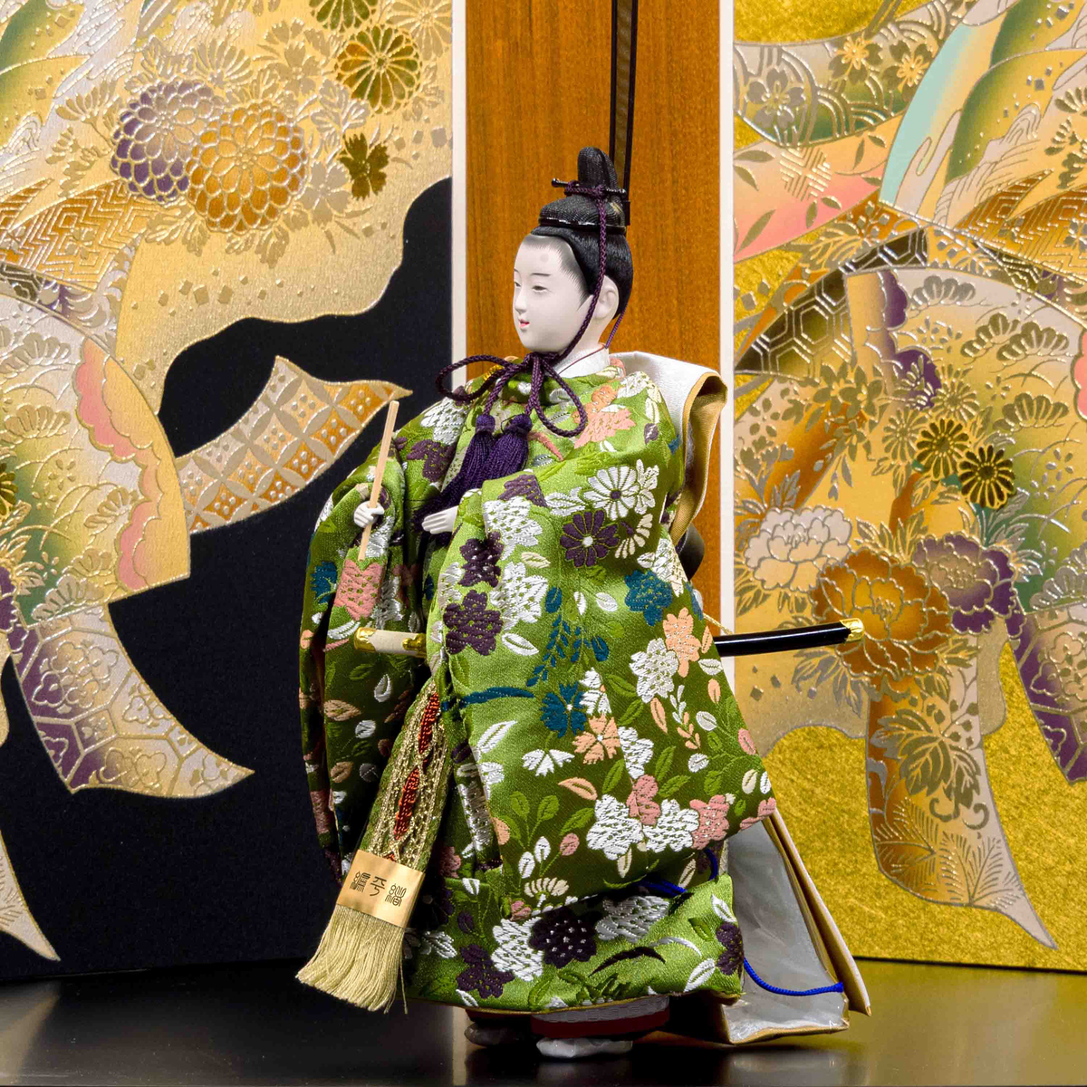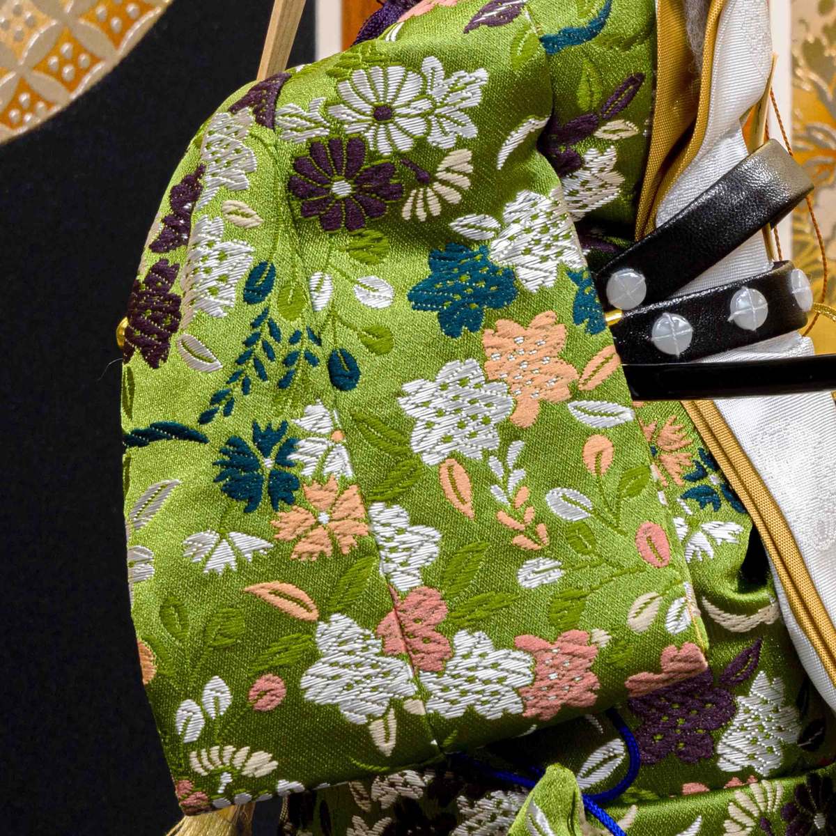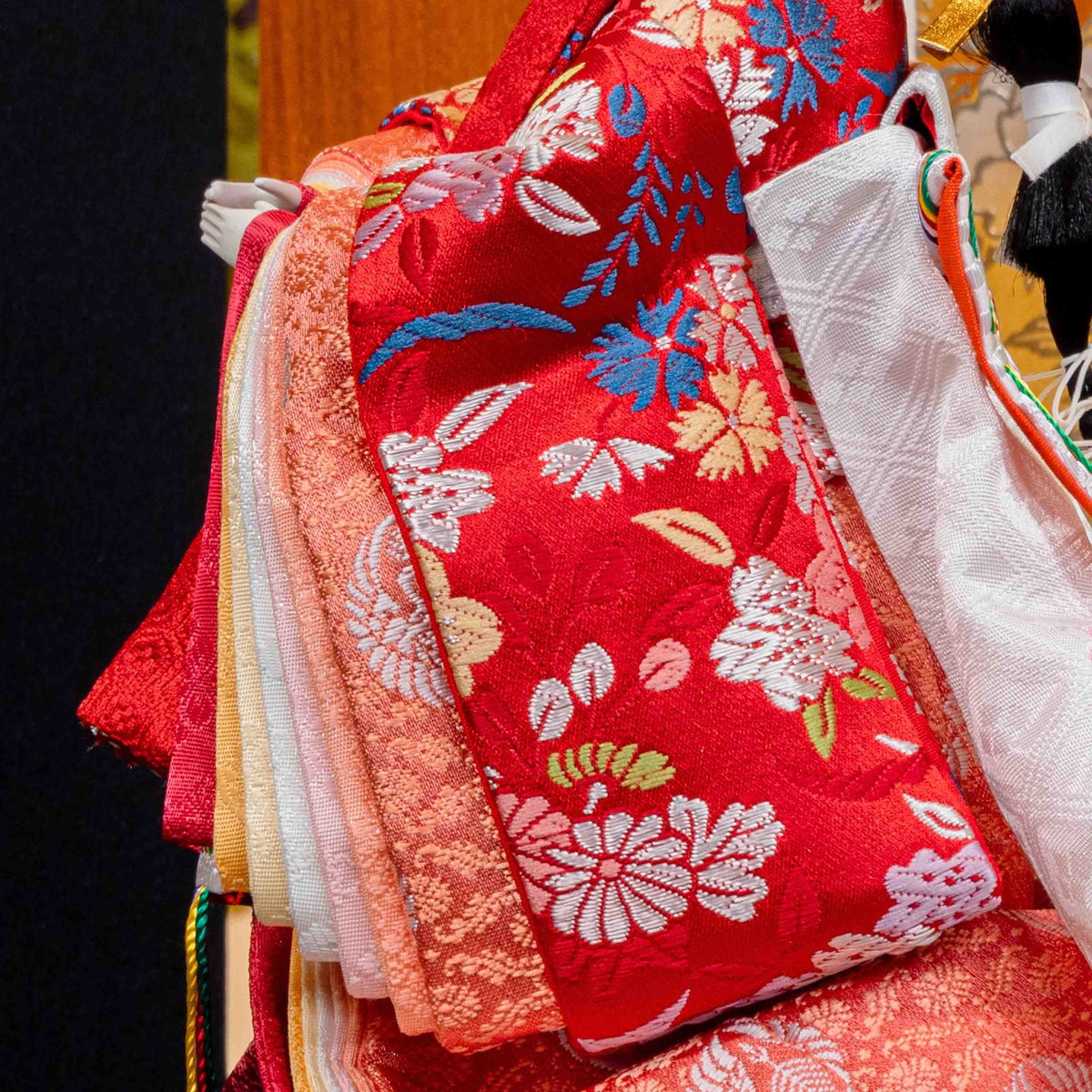 男雛の衣裳は、爽やかな緑色。女雛の衣裳は、可愛らしい赤の生地に、色とりどりの糸を用いて桜や菊など、四季の花を織り込んで華やかに仕上げました