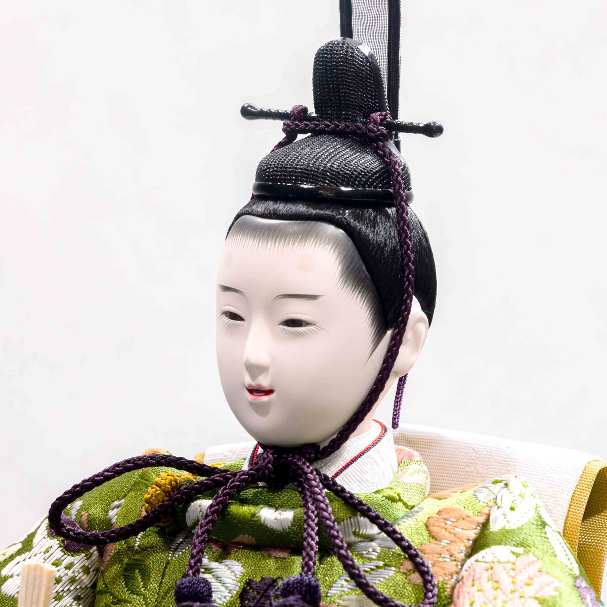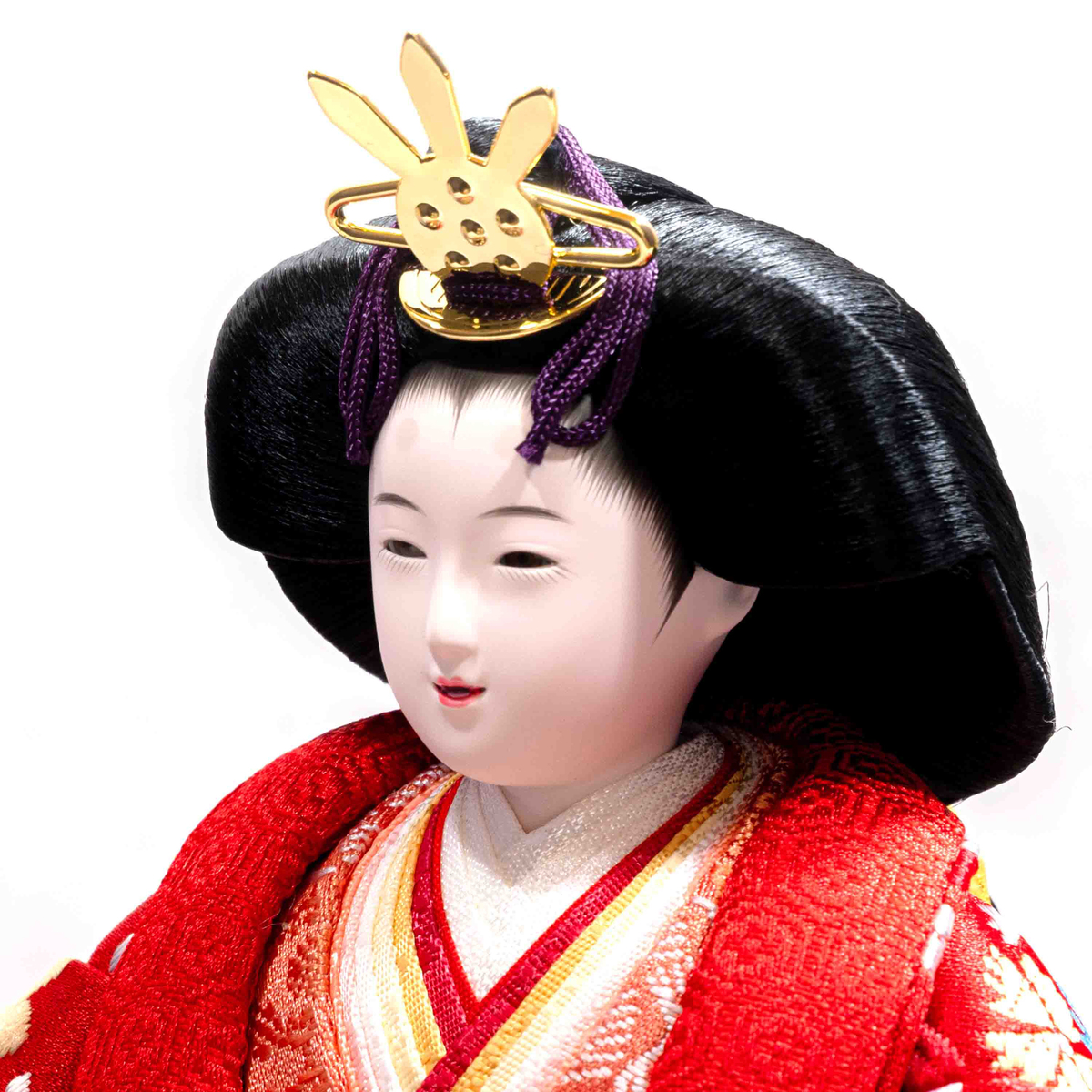 “人形は顔がいのち”でおなじみの「吉徳」。衣裳の色、柄、仕立ての美しさを表現した、立姿雛です。お顔は型抜き、胡粉塗り、目切り、目入れ、結髪、面相など、さまざまな工程を熟練した職人が技術を駆使して作り上げます