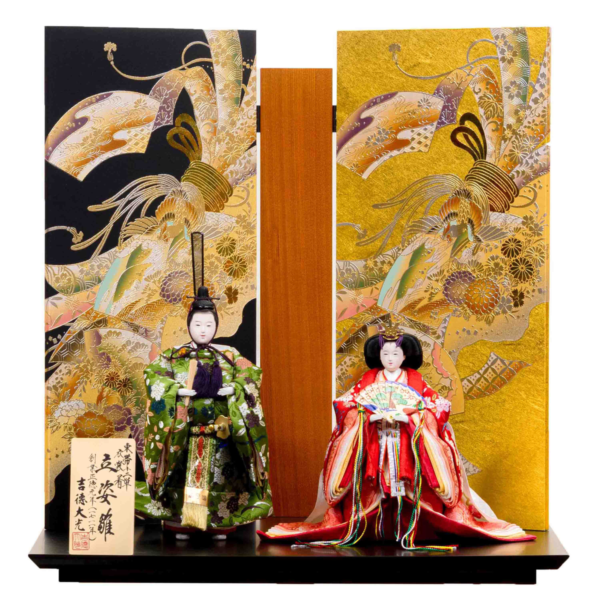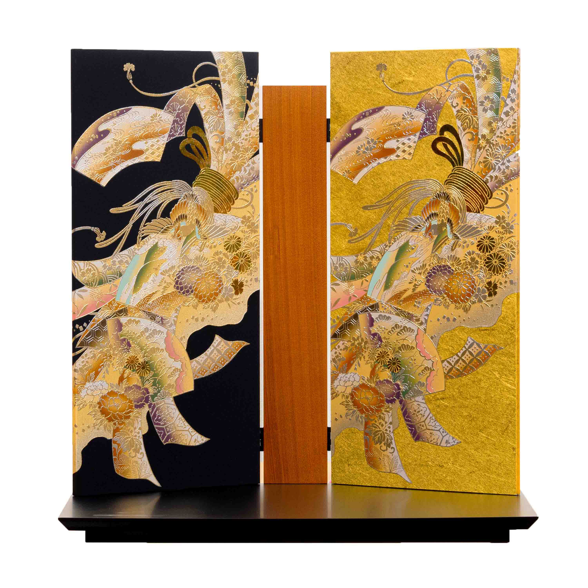 背景には、黒と金のコントラストが美しい、変則型の三曲屏風を配置。桜、牡丹、菊など様々な四季の花が描かれた熨斗目と、優雅に舞う鳳凰のおめでたい図柄を、金彩で描きました