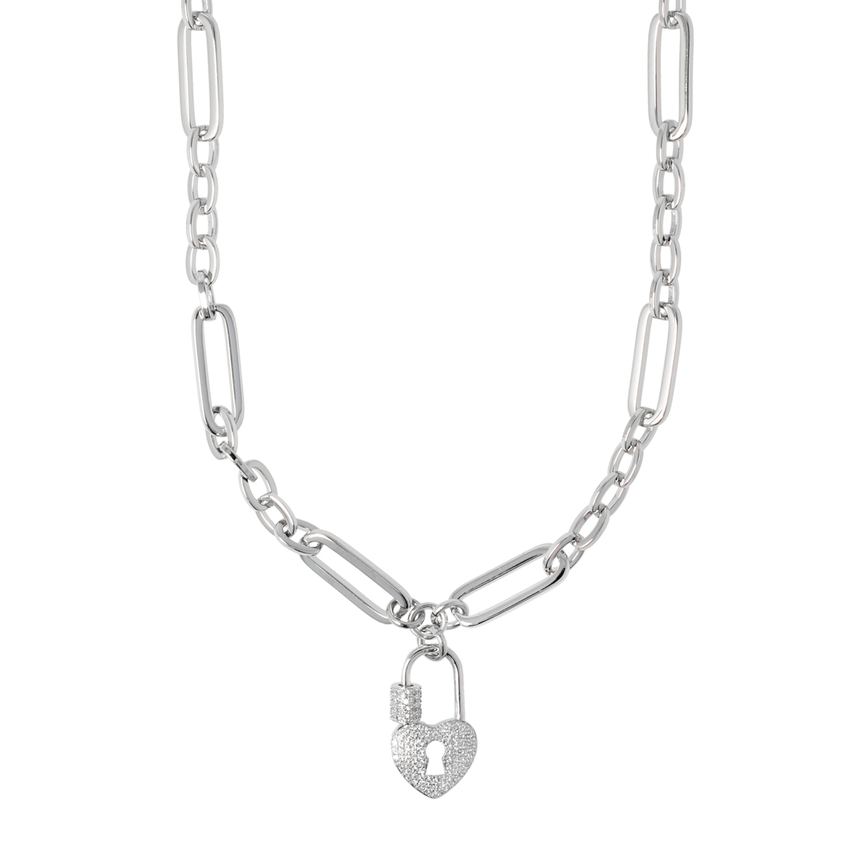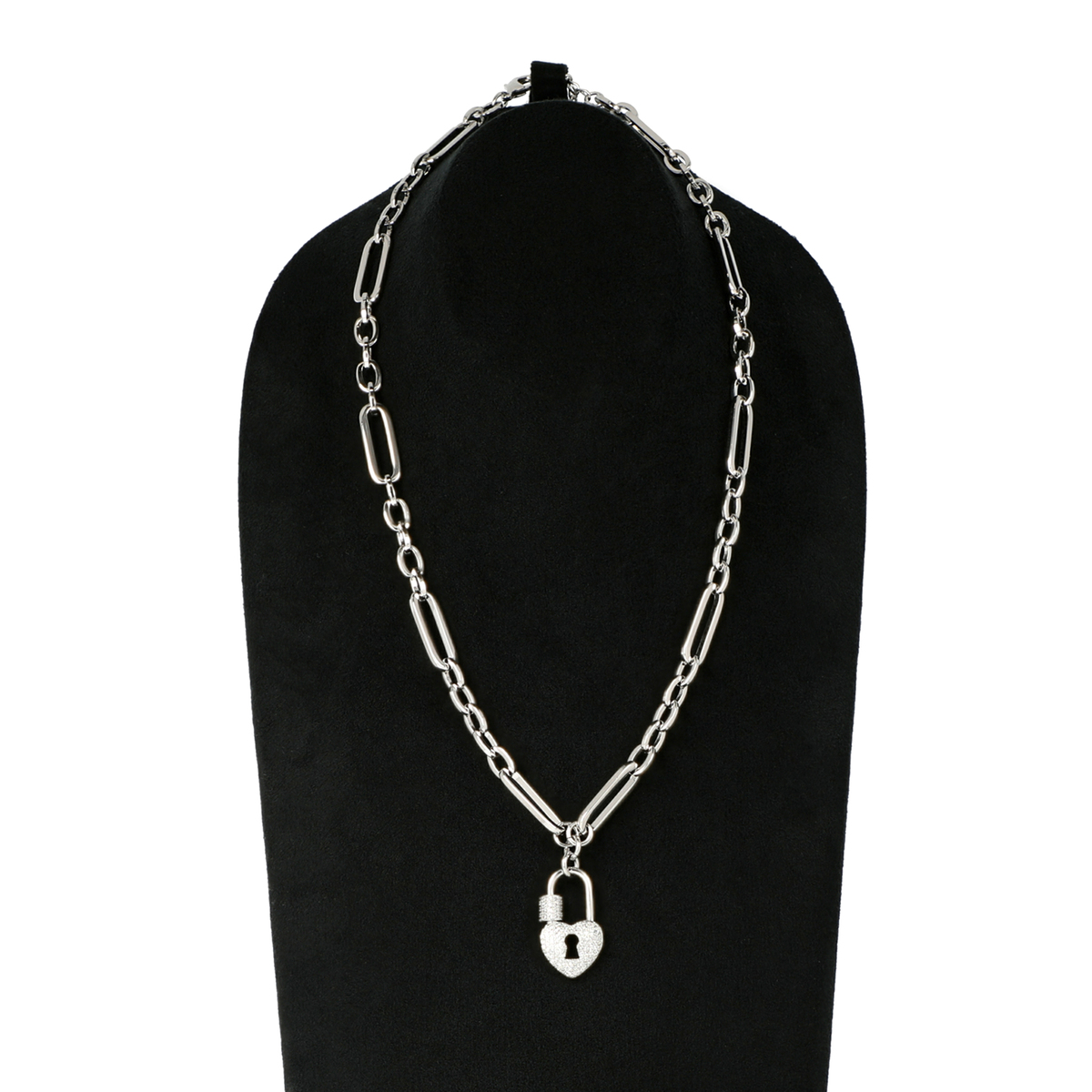 ハート型の南京錠(パドロック)をイメージしたチェーンネックレスです。ハートモチーフのパドロックにはキュービックジルコニアを隙間なく敷き詰め、大人の女性にも取り入れやすい上品な雰囲気に仕上げました