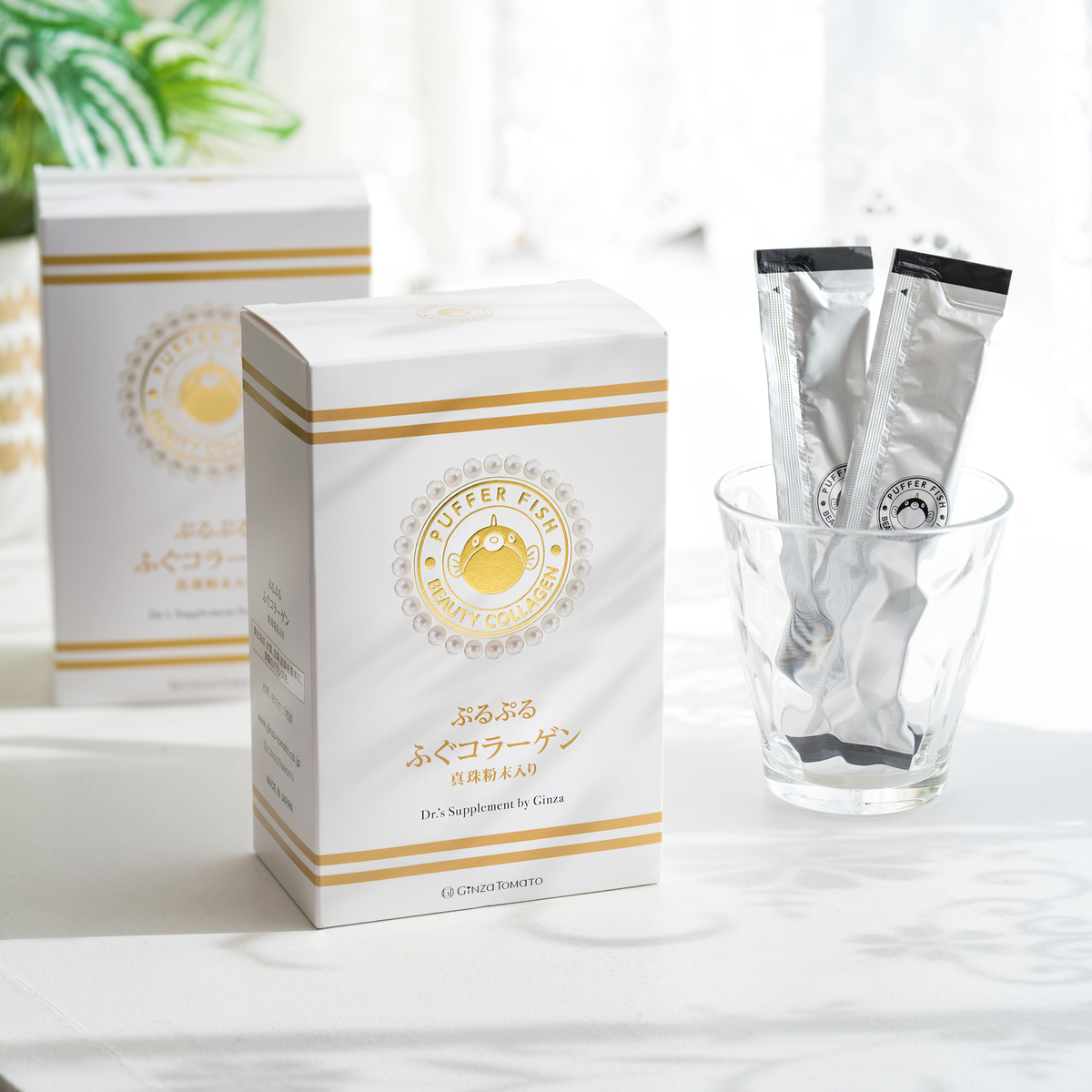 配合原料であるトラフグ抽出エキスに、山口県産のトラフグを使用した「ぷるぷるふぐコラーゲン」です。トラフグはヒアルロン酸、デルマタン硫酸が含有しており(トラフグ(トラフグ抽出エキス))、本品1包(12.5g)あたり、主にふぐの原料を由来とするコラーゲンを2000mg含有(*2)しています