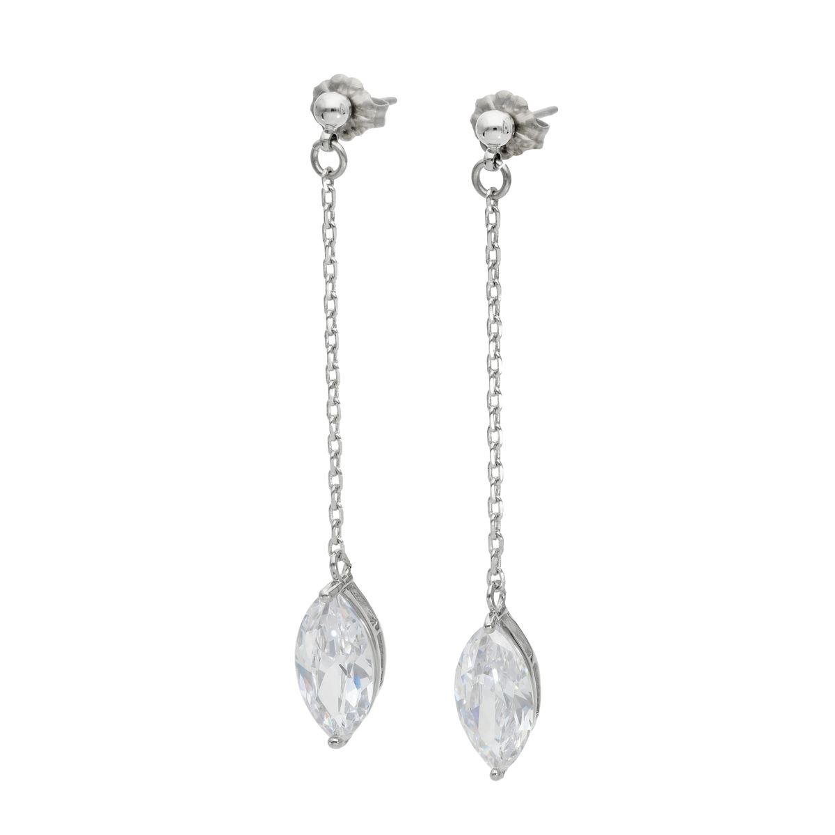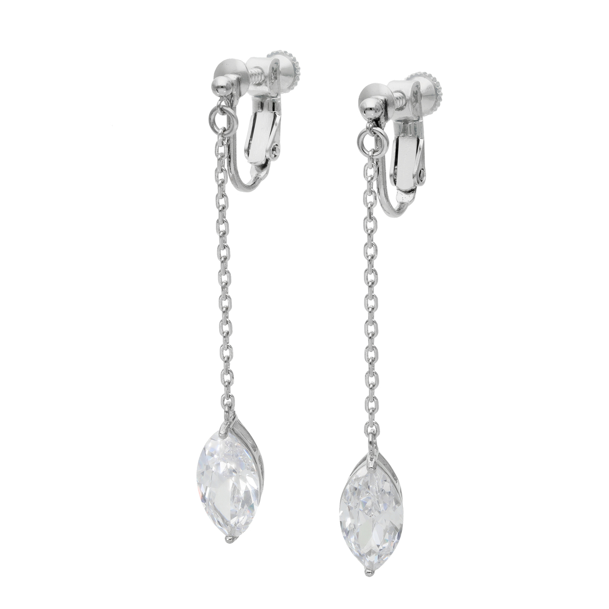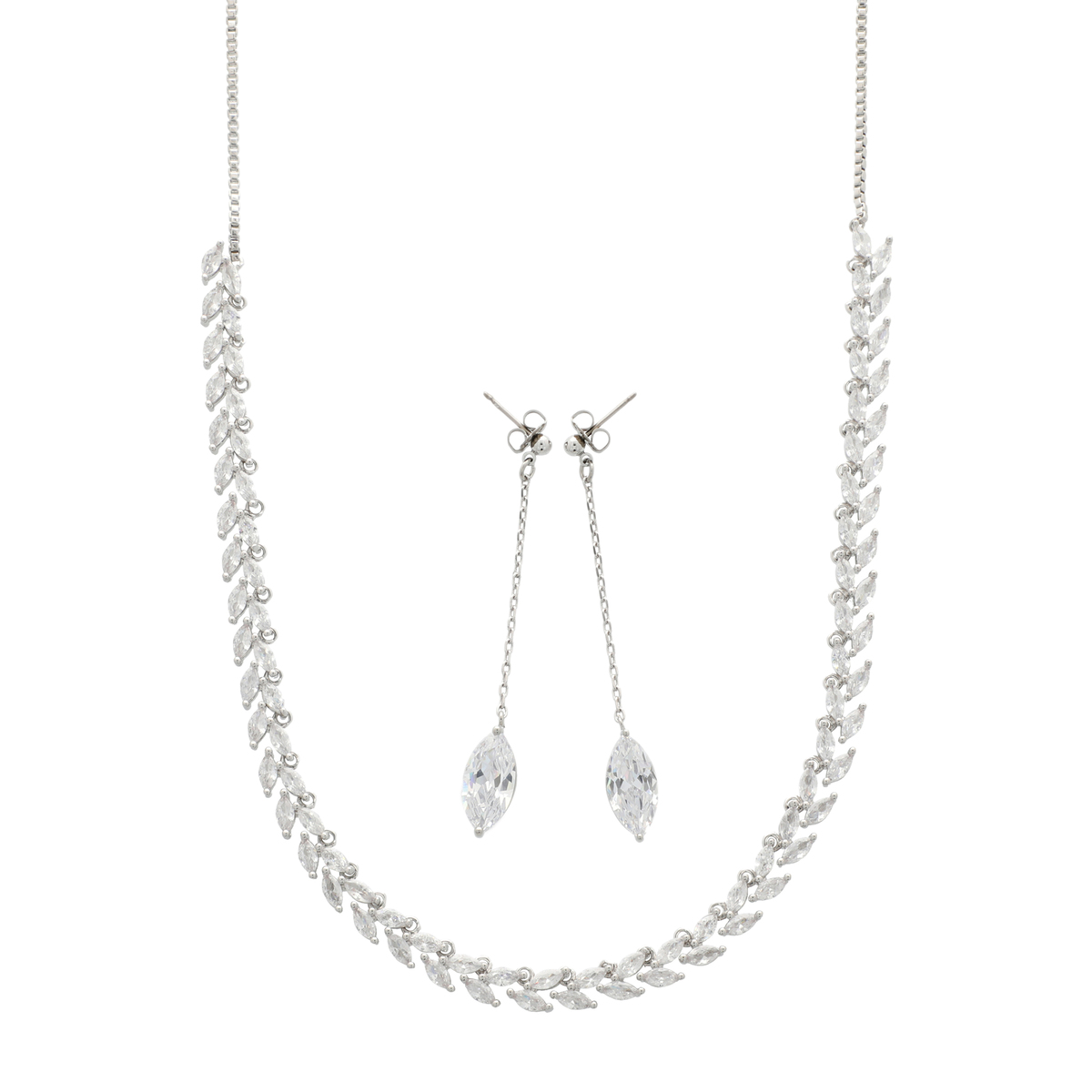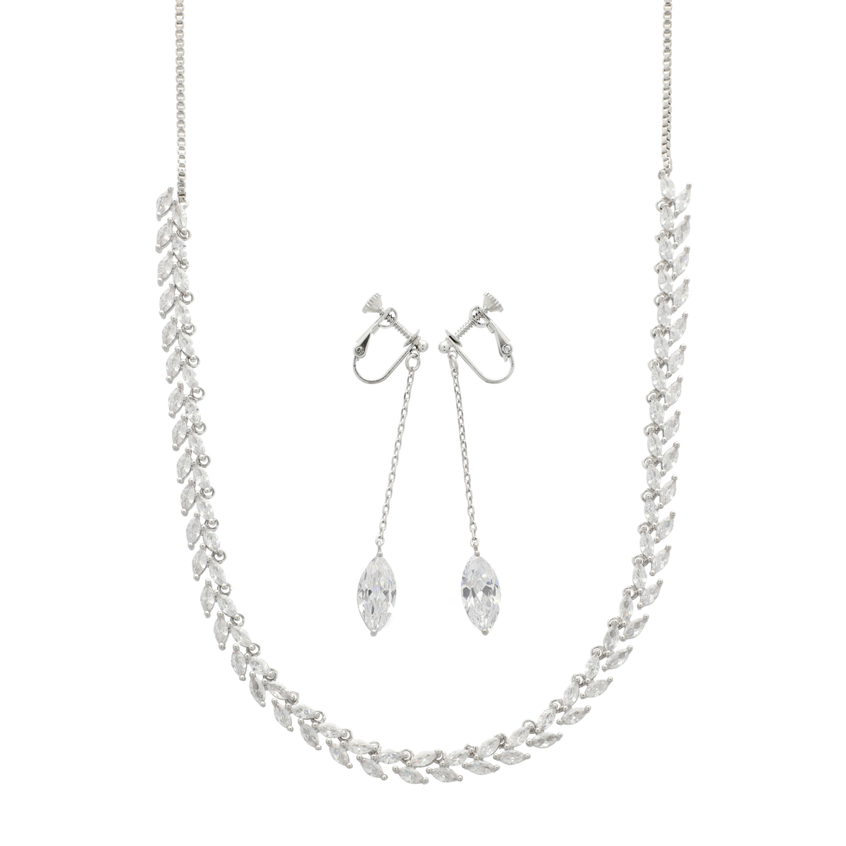 マーキスカットのキュービックジルコニアで作り上げたラインネックレスとイヤリングまたはピアスのセットです。ネックレスは、マーキスカットを互い違いに連ねることで、月桂樹の葉を思わせるような美しい仕上がりに。大粒のマーキスカットを使用したイヤリング/ピアスは、お顔まわりで優しく揺れて、表情を明るく見せてくれそうです