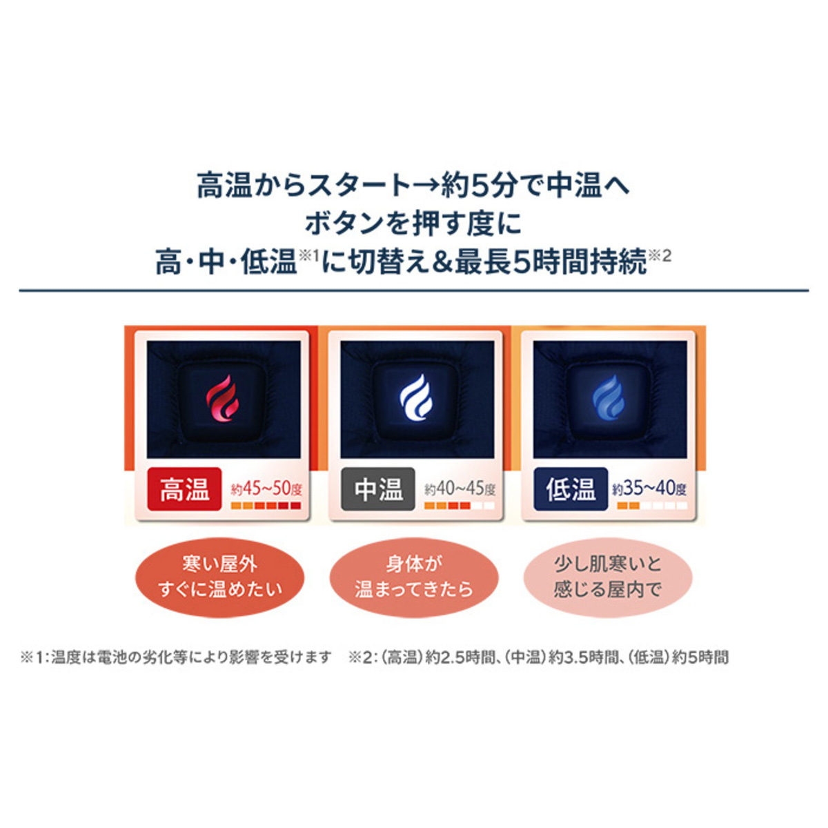 バッテリーを内ポケットの電源コードにつなぎ、左胸の電源ボタンを押すだけ。3段階の温度調節機能付きで、手軽に赤:高温(約45度〜50度)、白:中温(約40度〜45度)、青:低温(約35度〜40度)に温度切り替えができます(*2)
