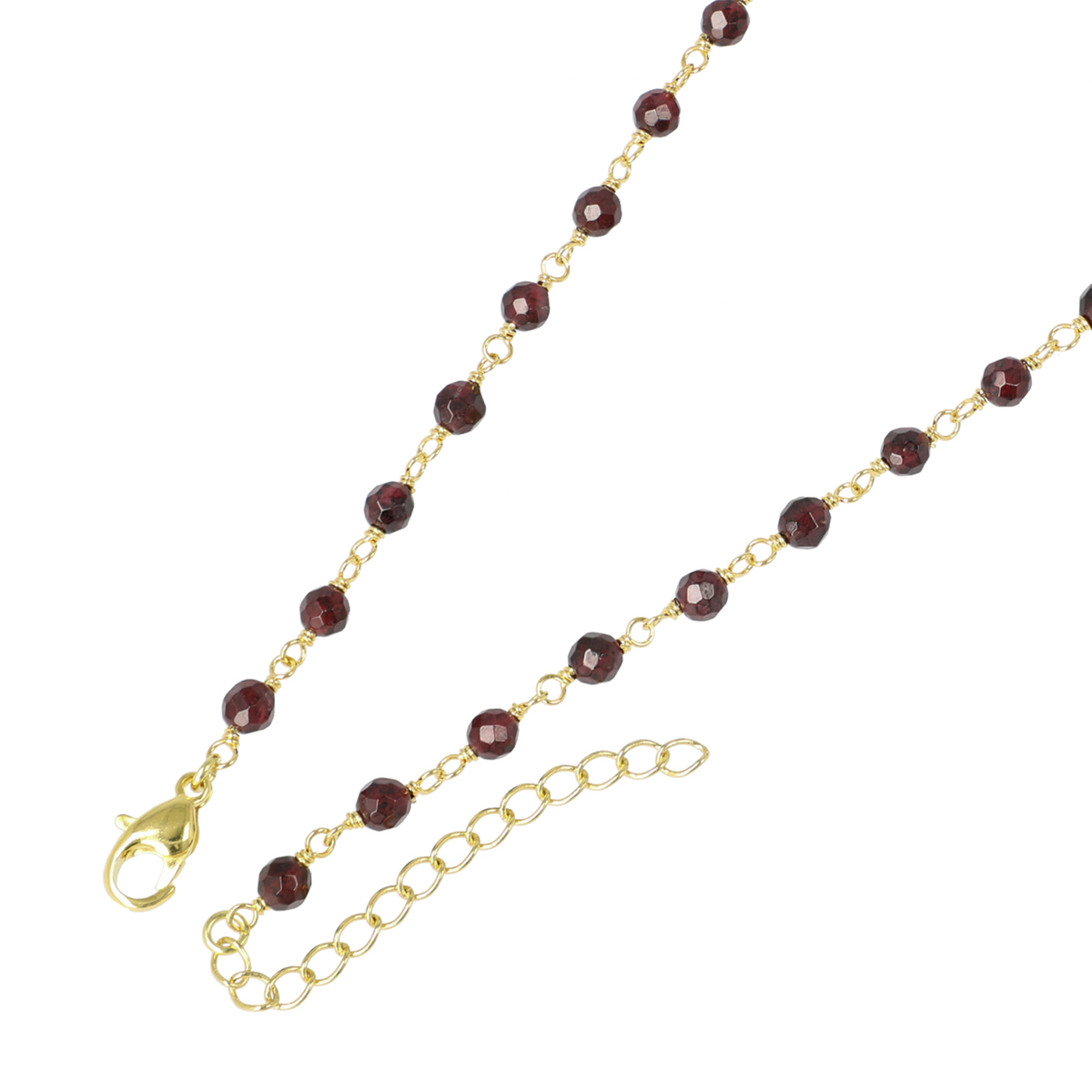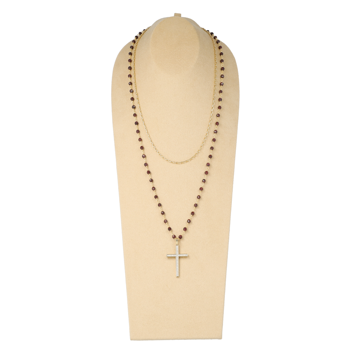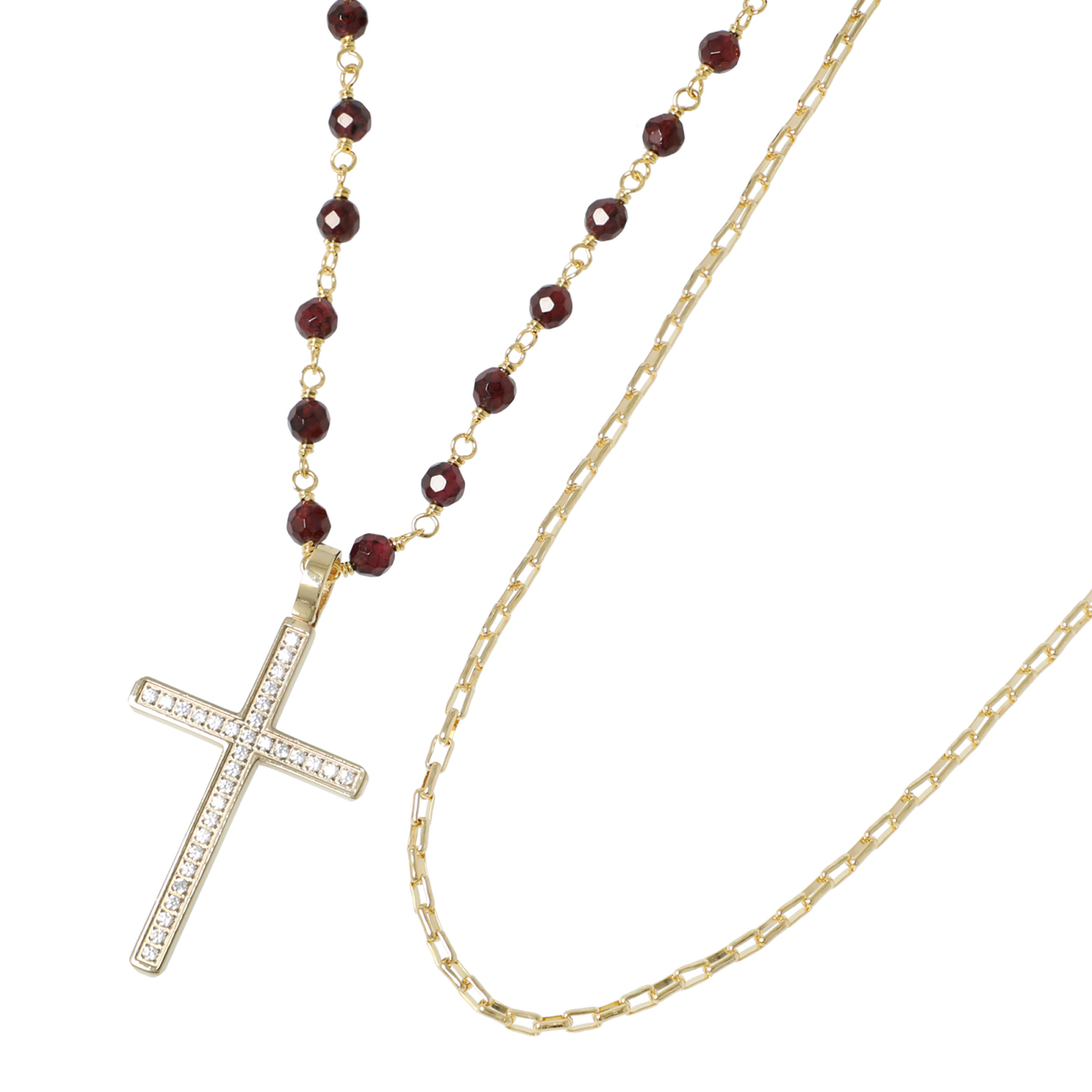 ガーネットのシンプルなネックレスにゴールド色の十字架のヘッドをつけた、優しくフェミニンな印象のネックレスと、シンプルなチェーンのセットです