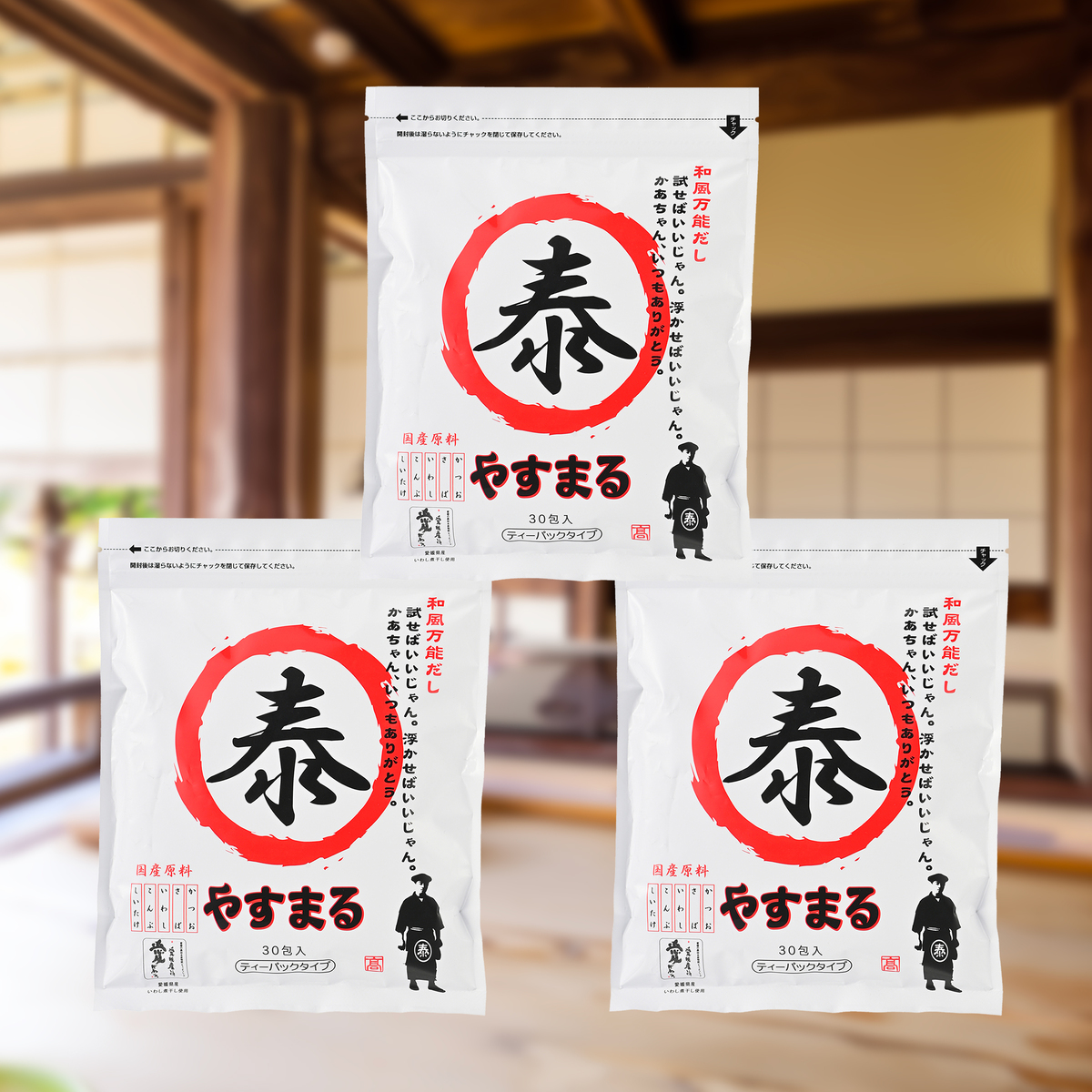 食塩、砂糖、粉末醤油、調味料などによる味付けで、そのまま煮出すだけで完成された味に。「やすまる」の和風万能だしです。1パックで500mlのだしを抽出。煮出すのはもちろん、500mlの水にだしパックを入れ、一晩置けばすっきりとしただしに。袋を破いて中身を料理に振りかければ粉末調味料として使え、炊き込みご飯などには1パックで2合分の味付けもできます