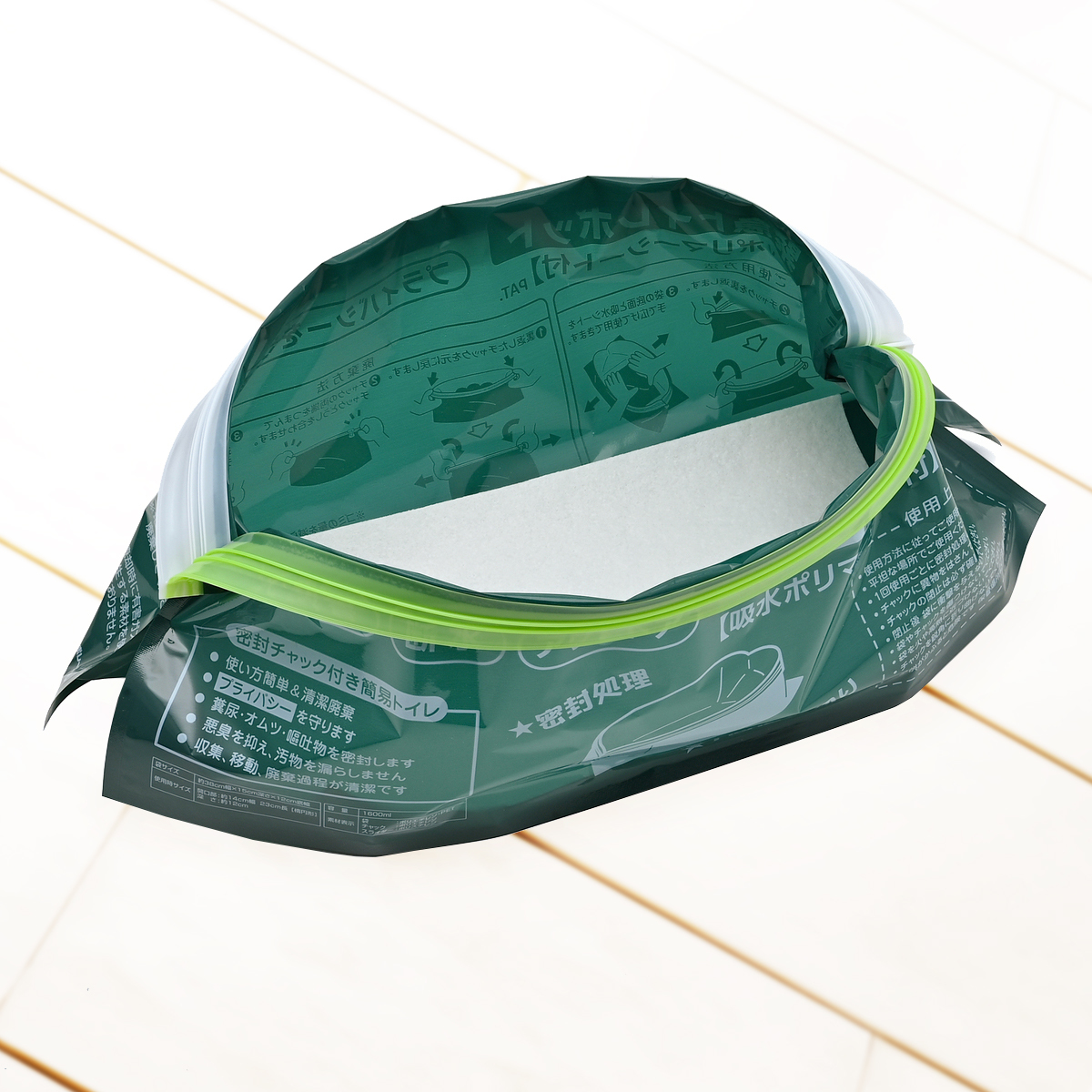 袋を広げてチャック部分を裏返し、ポリマーシートを入れるだけで使用できる緊急トイレポット。ポリマーシートが水分をゼリー状に固め、チャックを閉めることで臭い漏れを防ぎます
