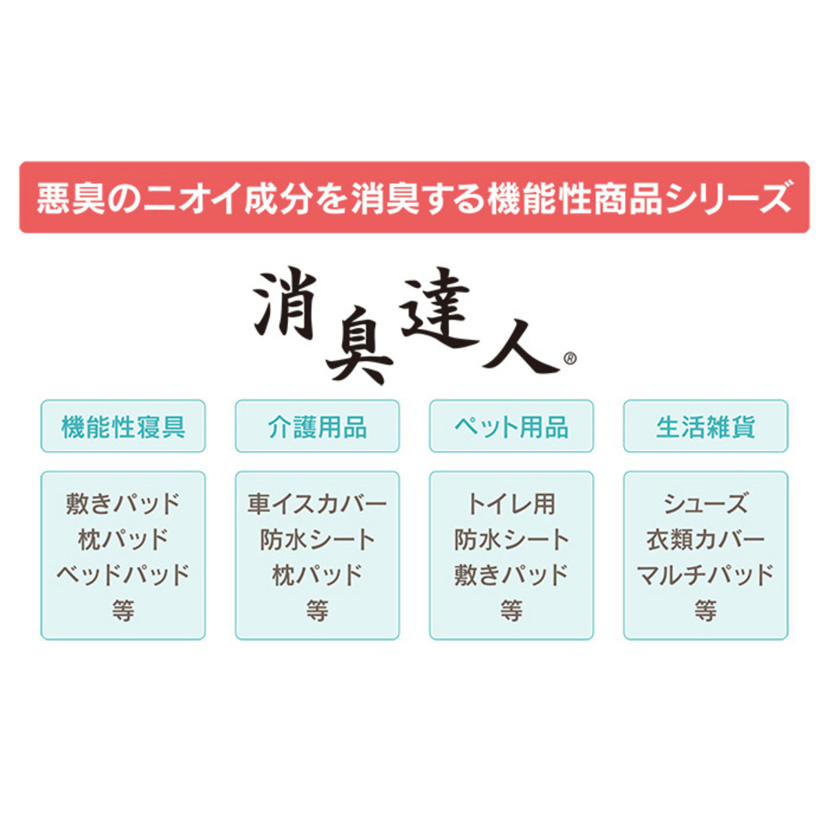 側生地には、シキボウ株式会社と丸ホームテキスタイル株式会社の共同企画である機能性素材「消臭ソムリエ」を使用。規定の洗濯回数以上の洗濯50回後での試験でも、アンモニア、イソ吉草酸、ノネナールについて消臭基準値を満たしています
