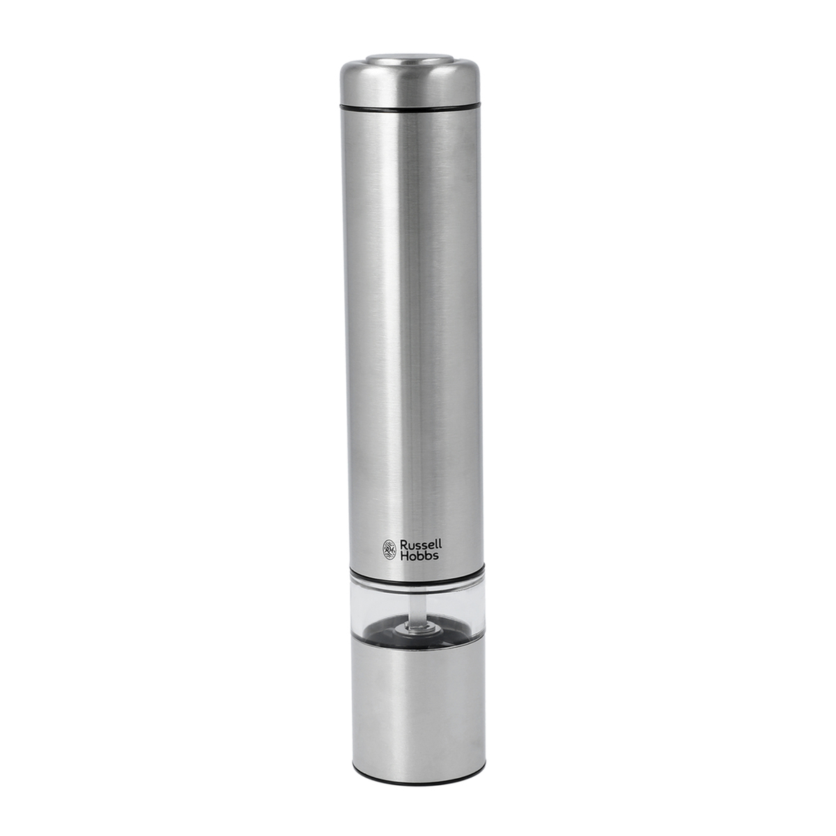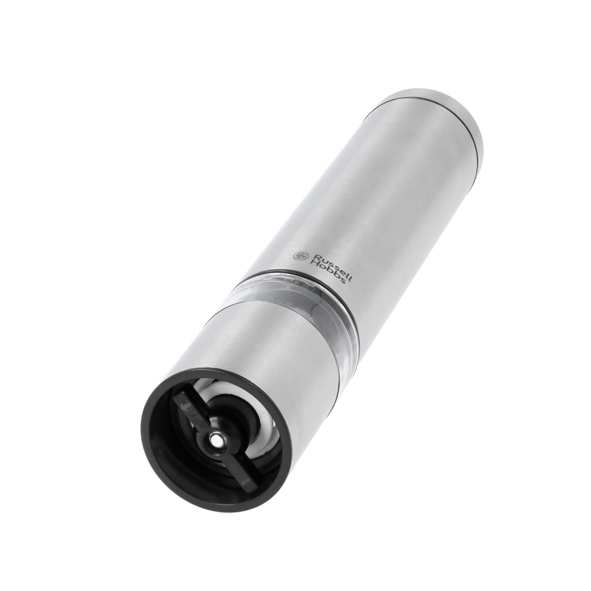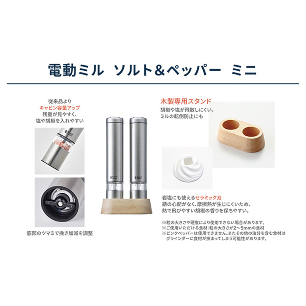 [商品内容] ・電動ミル2本 ・スタンド1個 [サイズ約] 径3.5×高さ18.5cm (スタンドセット:10.5×5.5×19.5cm) [重量] 1本約200g(乾電池含まず) [材質] ステンレス、セラミック、PCTG樹脂、ABS樹脂 [使用電池] 1本につき単4乾電池×4本(別売り) [ご使用頂ける塩・胡椒] 大きさが2mm〜5mm食材 ブラックペッパー・ホワイトペッパー・グリーンペッパー・クリスタルソルト・岩塩・ピンク岩塩・花椒(ホァショー)・山椒・その他乾燥ハーブやスパイス [使用方法] 1.引き加減を調整します。引き加減の調節はキャビンユニット底部のツマミで調整してください 2.スイッチボタンを押すと食材が挽かれます。挽く量はスイッチボタンを押している時間で調整してください 3.使用後は、スタンドに載せると食材がこぼれずに保管できます ※ツマミを緩くしすぎるとツマミが回転シャフトから外れてしまったり、テーブルに置いた際に不安定になります。ツマミがキャビンユニットの先端部を超えないように調整してください [注意事項] ※使用不可:漂白剤、食器洗い機 ※調理中の湯気などの湿気が本体に入り込まないようにご注意ください。故障の原因となります ※粗さが調整できない場合または、食材がグラインダー(臼の部分)に詰まった場合は一度、モーターユニットをキャビンから外して再度ご使用してください ※食材がグラインダー部分に詰まってスムーズに動かなくなってしまった時には、下記方法をお試しください 1.モーターユニットをキャビンユニットから取り外し食材を取り出す 2.ツマミを反時計回りに回し、グラインダーに詰まっている食材を取り除いてください。食材が詰まった際には強くたたいたりしないでください。故障の原因になります ※塩分や本体のステンレス部分に付着していると、そこからサビが生じる原因なる場合がありますので、こまめにお手入れをしてください ※本体のお手入れはやわらかい乾いた布やまたは、湿らせた布で拭いてください ※本体のふき取りにはアルコール・ベンジン・シンナー・磨き粉・タワシなどは傷や変色・変形する原因になりますので使用しないでください ※本体は水につけたり、水洗いをしないでください。故障の原因となります ■取り扱い説明を充分にご確認の上、ご使用下さい 【中国製】 [注意事項]続き ※ピンクペッパー・その他の水分や油分を含むスパイスは使用できません ※岩塩(クリスタルソルト)は様々な種類のものが販売されているため、粒の大きさや硬度により使用できない場合があります。大きさについては粒胡椒の大きさを参考にお選びください