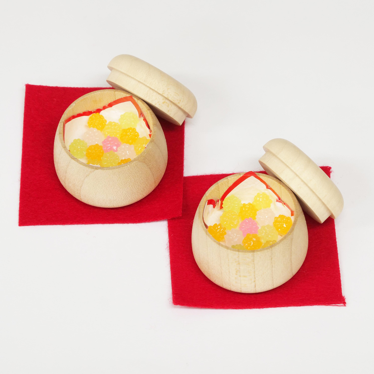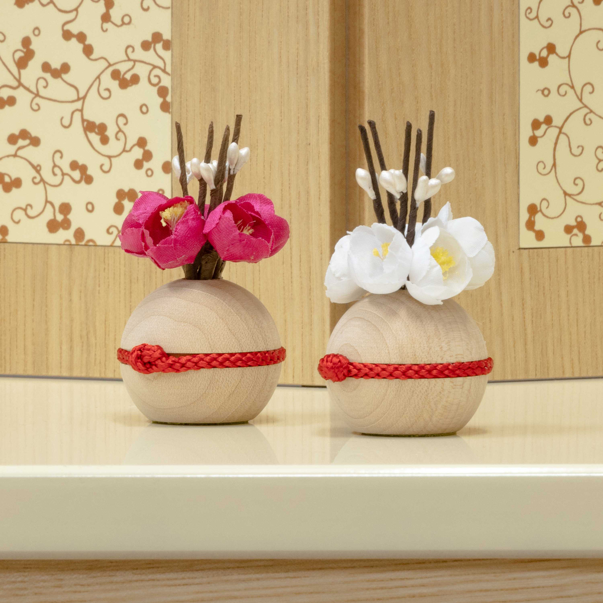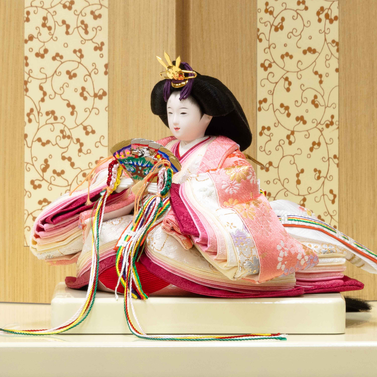 コンパクトながら、初節句、ひな祭りのお祝いを華やかに彩ります。飾り台がそのまま収納箱になるので、飾り終えたお人形やお道具をすっきり収納できます