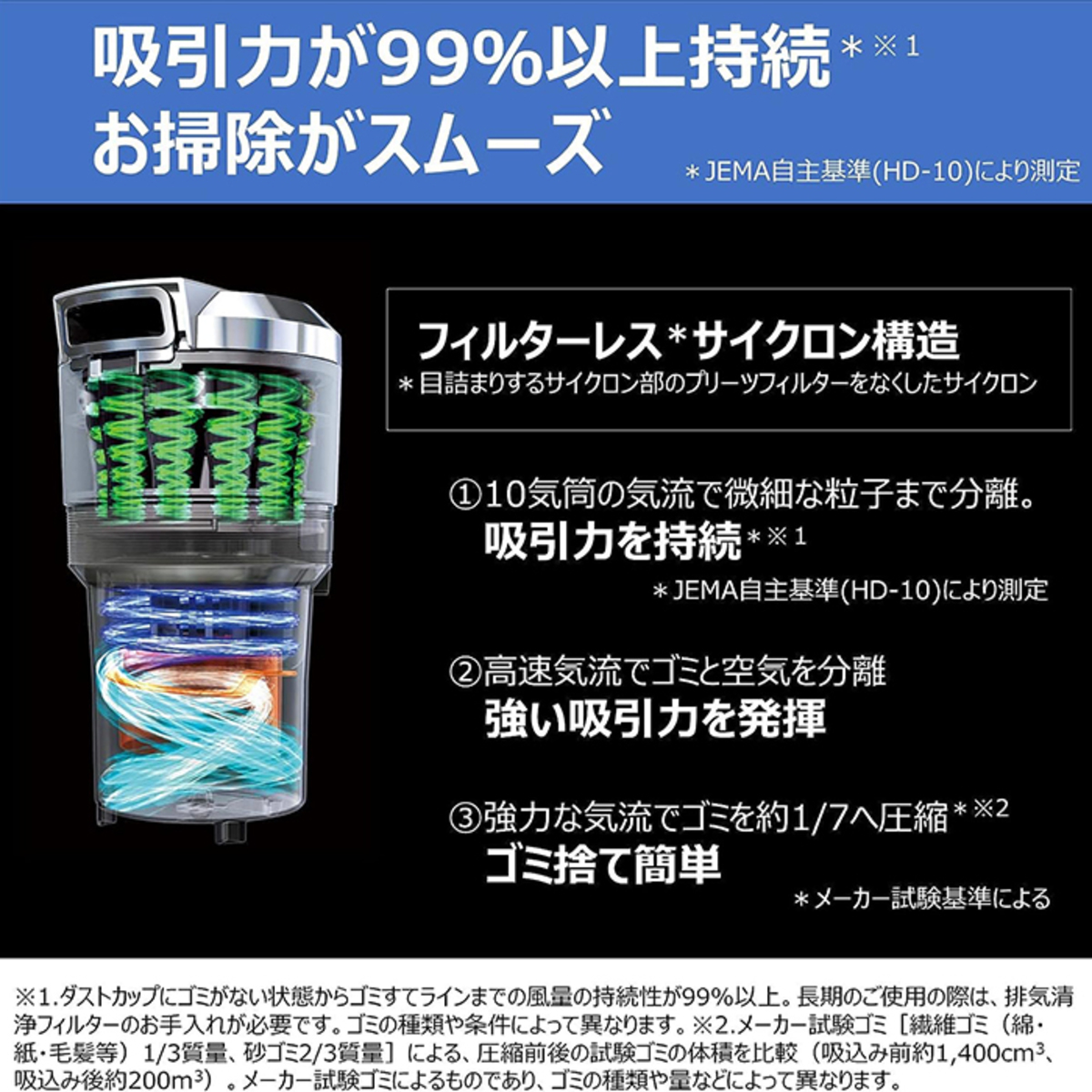*1)日本電気工業会自主基準「電気掃除機の吸い込み力持続率測定方法」による、ダストカップにゴミがない状態からゴミすてラインまでの風量の持続性が99%以上。長期のご使用の際は、排気清浄フィルターのお手入れが必要。ゴミの種類や条件によって異なります