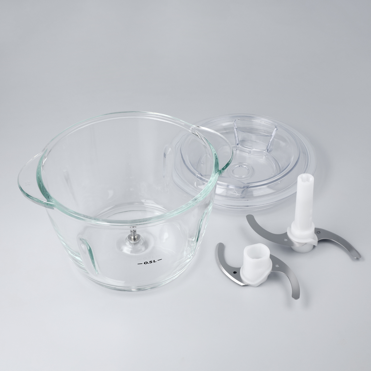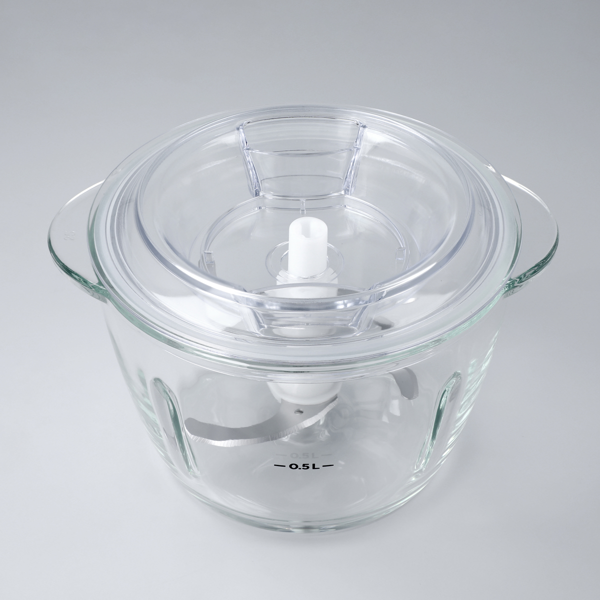 コンパクトながらも、最大内容量は500mlと使い勝手の良い仕様。ボウルはガラス製で、材質特性として長く使い続けても傷や匂いがつきにくく、油汚れを落としやすいので、肉や魚のミンチを作ったときの油のヌメリ感をさっと洗い落とすことが可能。また、フタにはゴムパッキンが取り付けられているので、冷製スープやスムージーなども作ることができます