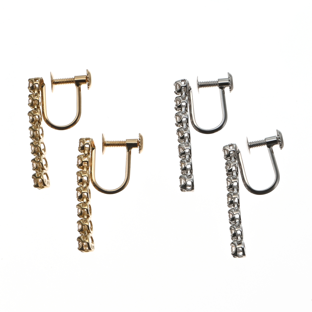 素材:[ダイヤモンド] ラウンドシェイプ 爪留め 14石 合計0.22ctUP [地金] 18Kホワイトゴールド または 18Kイエローゴールド <イヤリング> 縦X横(約) 20.5×3.0mm 総重量(約) 1.7g 留具の形状 スクリュー <ピアス> 縦X横(約) 20.5×3.0mm 総重量(約) 1.3g 留具の形状 ポスト&キャッチ(シリコン付) ■受注発注商品のためデザイン・価値に影響のない範囲で仕様が変わる場合がございます ■素材の大きさ・形・色合い、製品のサイズは1点1点多少異なります 【日本製】
