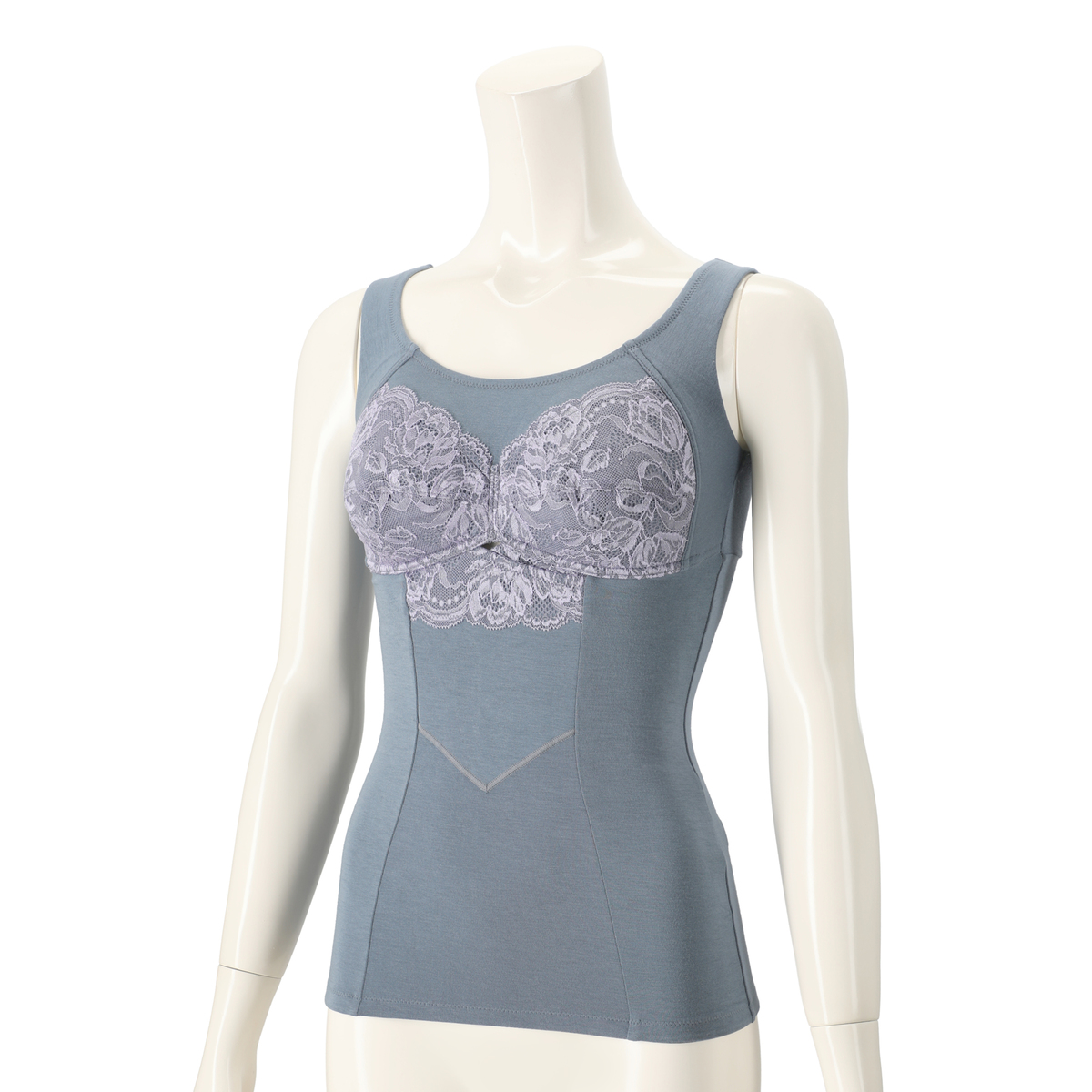 表カップとアンダー部分にはチューリップをモチーフとした国産のストレッチレースを使用。エレガントな雰囲気を演出しながら、伸縮性もあります。胸元は高めに設定しており、薄いテープを内側に入れることで身生地をフィットさせ、バストの削げやお辞儀をした際のチラ見えが気になりにくい仕様です