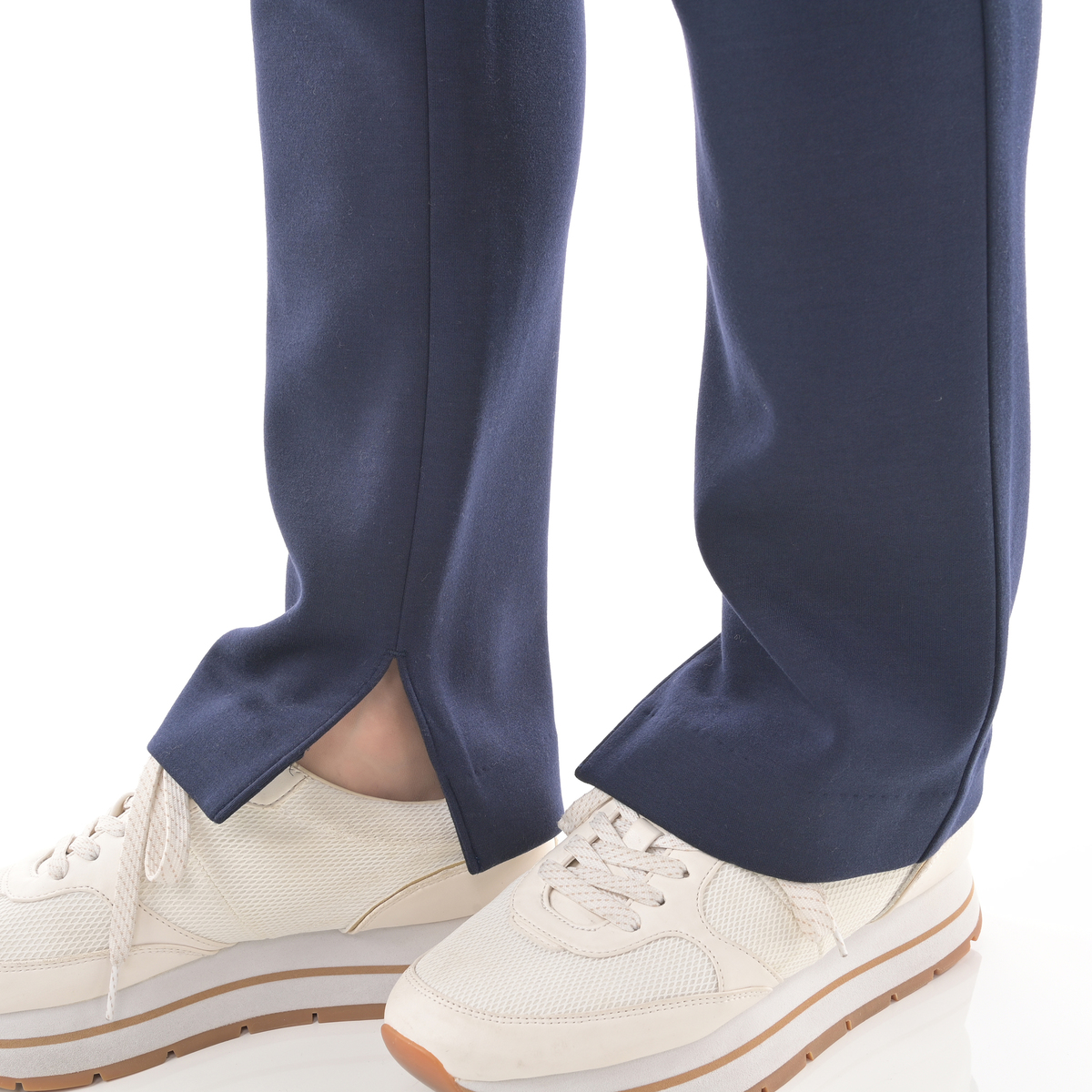 後ろダーツ入りでヒップが立体的に見える構造。内裾に深いスリットが入っており、穿くと靴の甲に裾がかぶり脚長に見える、スニーカーパンツです。ダンボールニットで、程よいストレッチと肉感が身体のラインを拾いにくくなっています