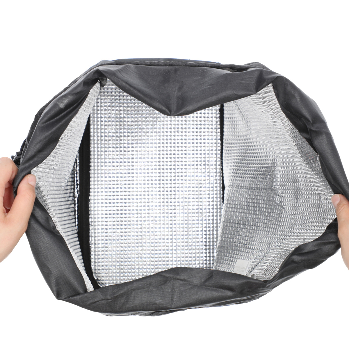 バッグは簡単にフレームから取り外すことが可能。バッグの内側は、全面アルミ蒸着シート張りで保冷機能もあります。荷物が少ない時は、バッグのサイドのスナップを留めて小さく。また、フレームも畳めてタイヤも外せるので、コンパクトに収納することもできます