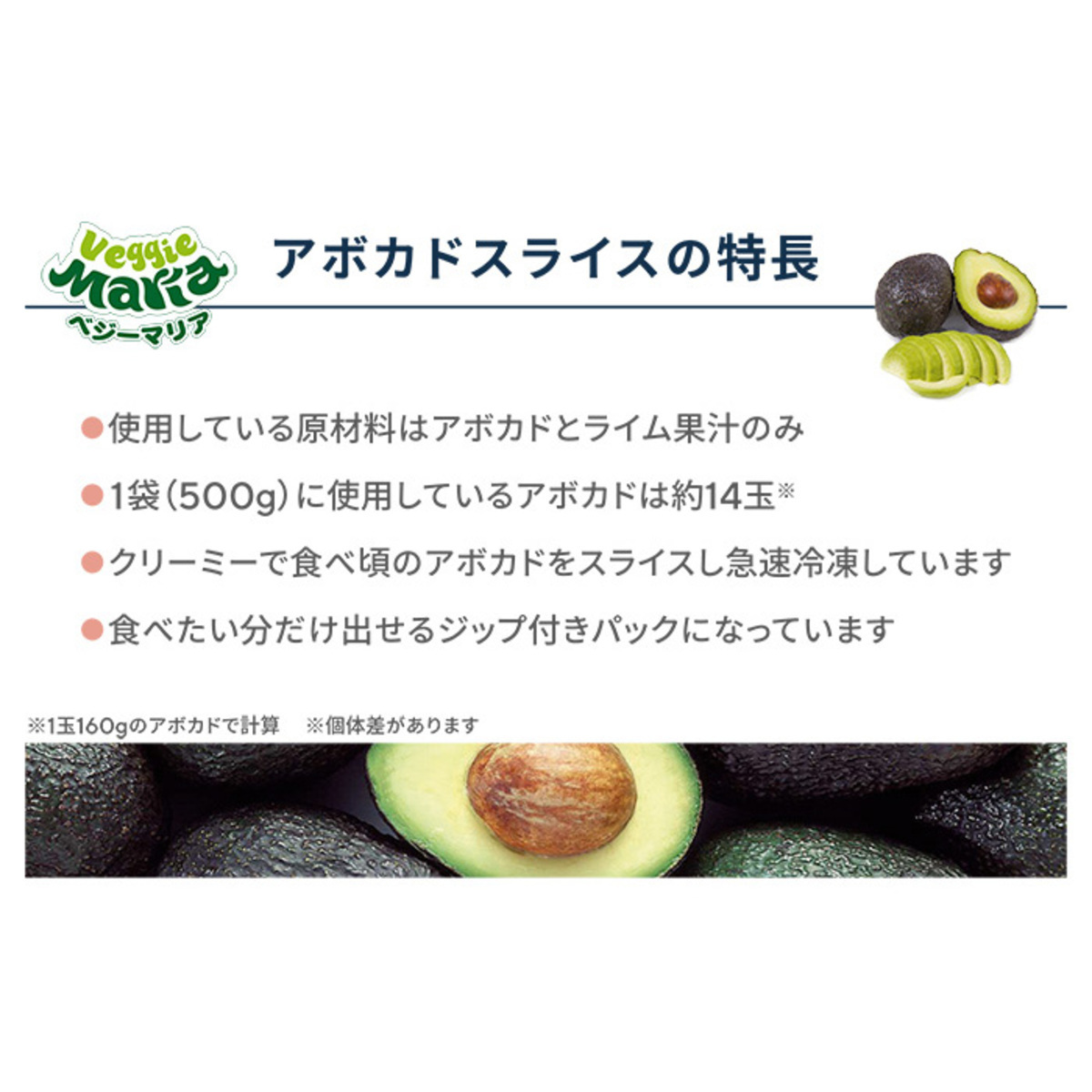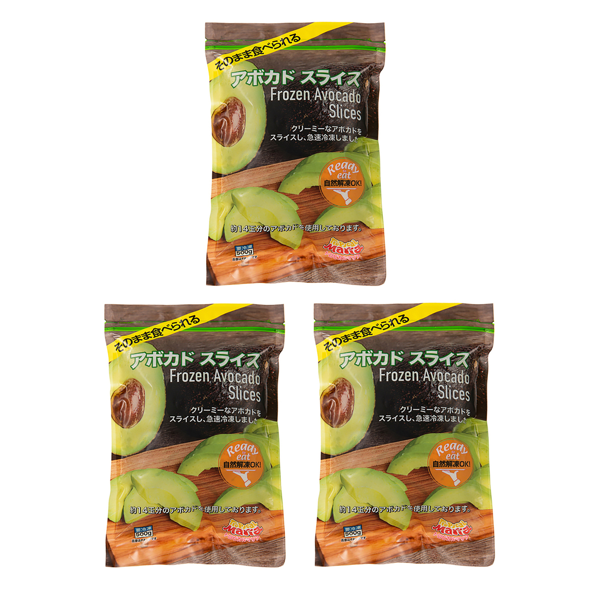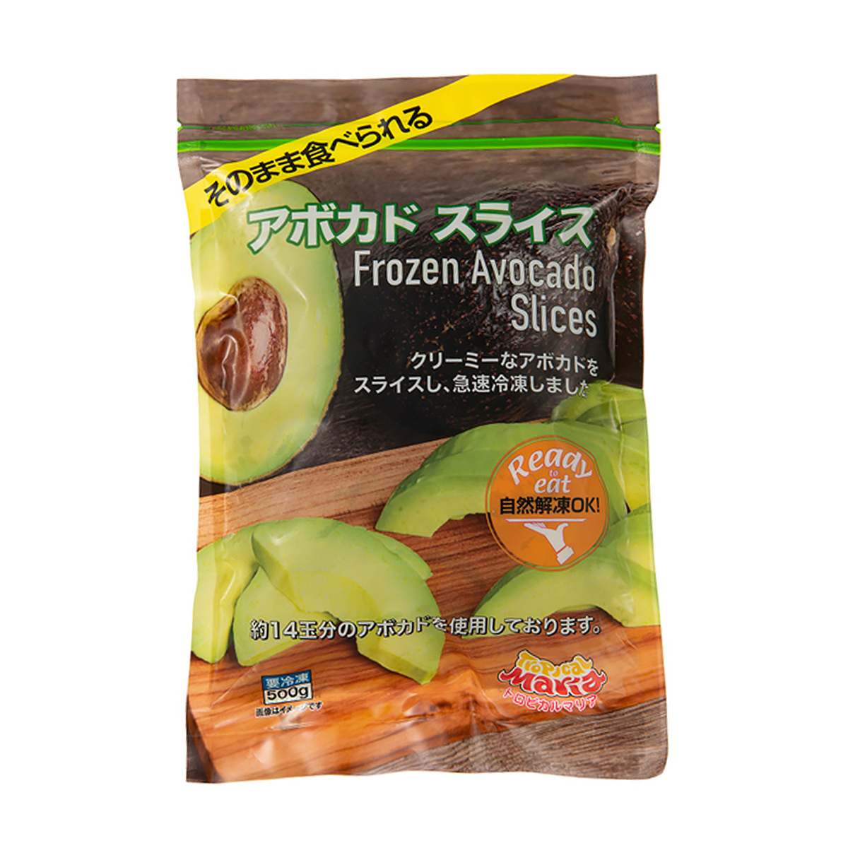 クリーミーで食べ頃のアボカドをスライスして急速冷凍。1袋(500g)で使用しているアボカドは約14玉です*。食べたい分だけ出せるジップ付き袋に入ってるので、面倒な手間なくお使いいただけます