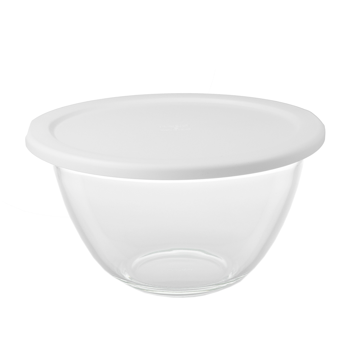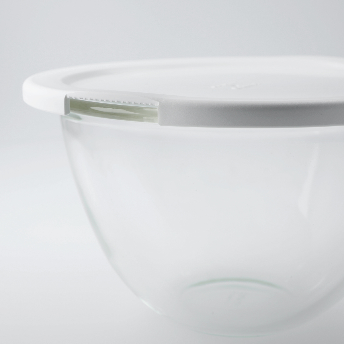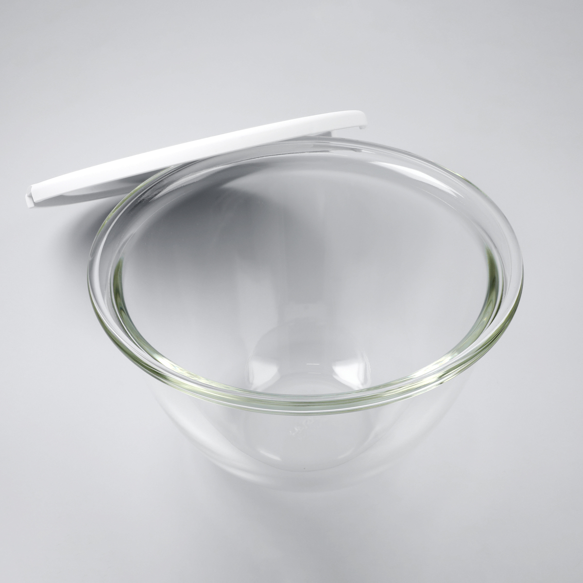 調理など混ぜやすい形状の耐熱ガラス製ボウル。ガラス容器は「HARIO Glass(R)」を使用。「HARIO Glass(R)」は天然素材(珪砂・硼砂・硼酸・アルミナ・食塩)を使用したガラスで、耐熱温度差120℃(JIS S 2030耐熱ガラス製食器 4.1熱衝撃試験に準ずる試験)です(*1)