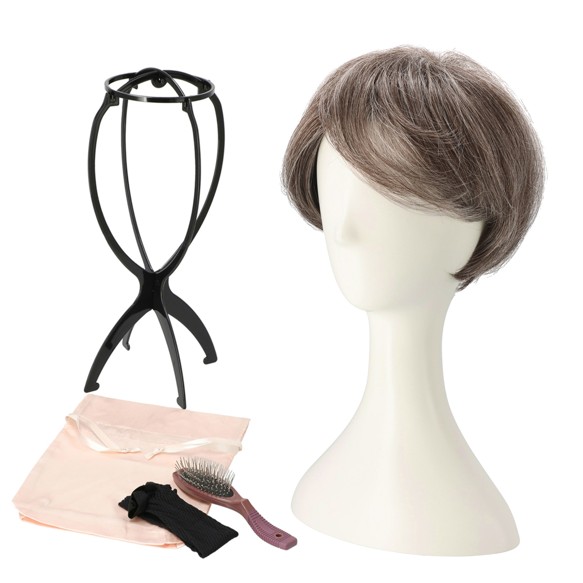 素材はコシがあり自然に見えてお手入れしやすい日本製のカネカロンを使用。ウィッグスタンド、ポーチ、ブラシ、ネットが付属しています