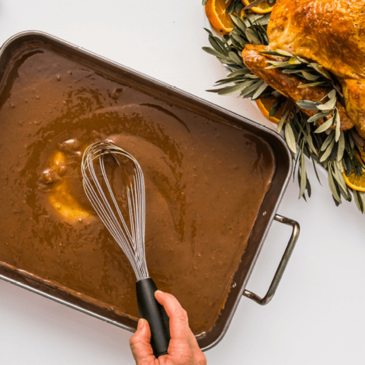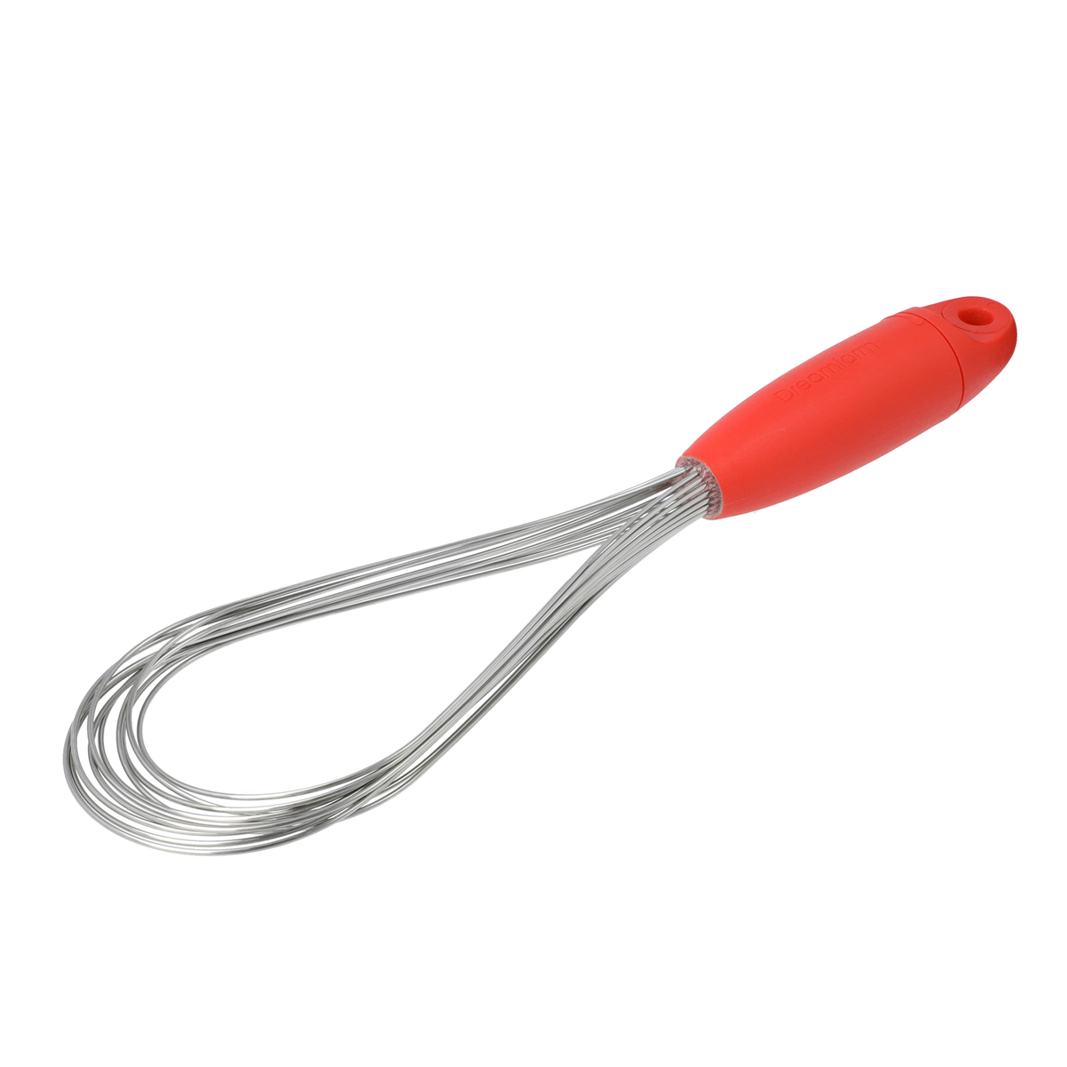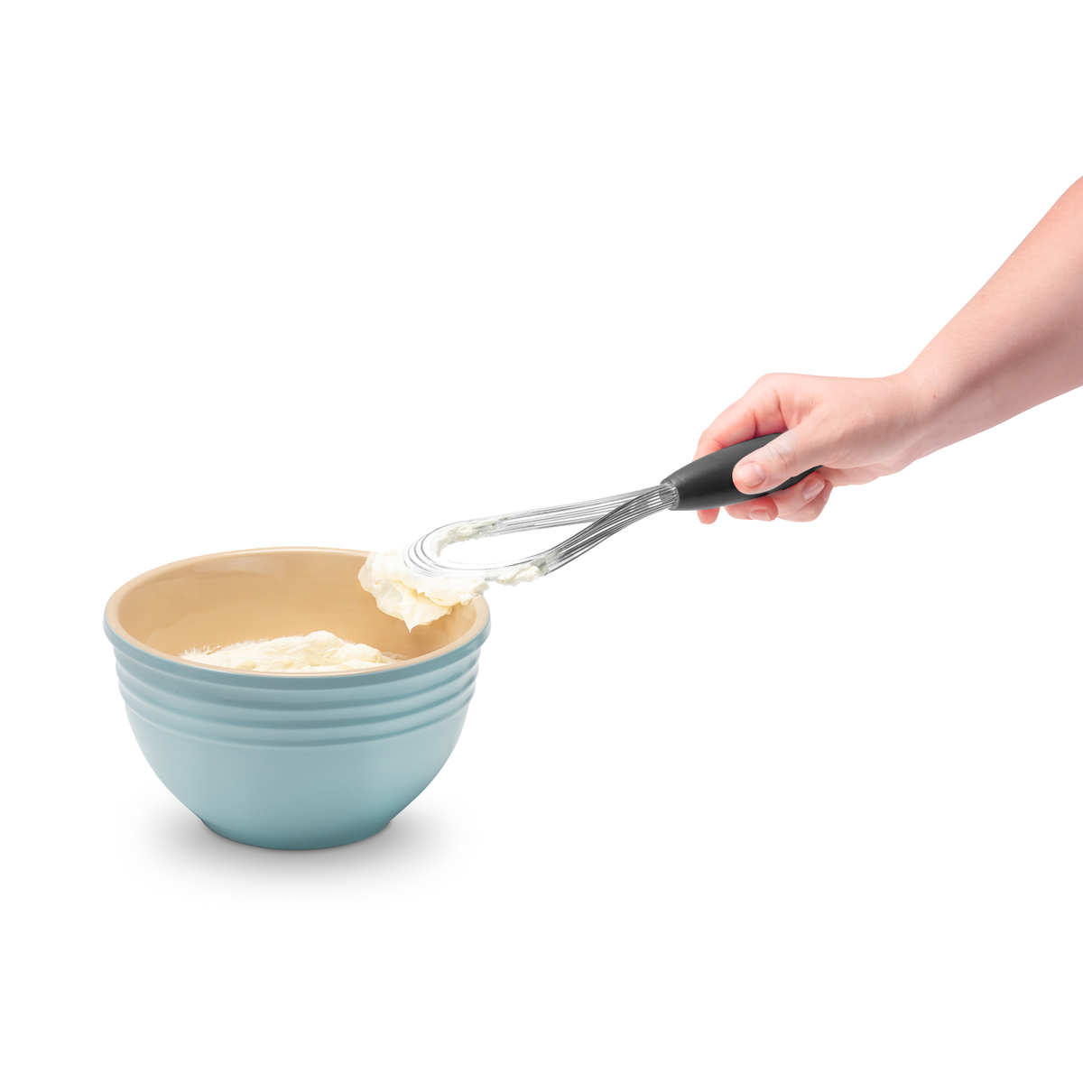 持ち手の先端をひねると、泡立て部分の形状が3段階に変化するウィスク。用途にあわせてバルーンウィスク、ソース向けのリボンウィスク、フラットウィスクを使い分けできます。泡立て部分をフラットに折りたためるので、収納しやすい点も魅力です