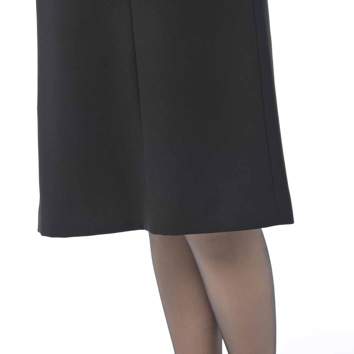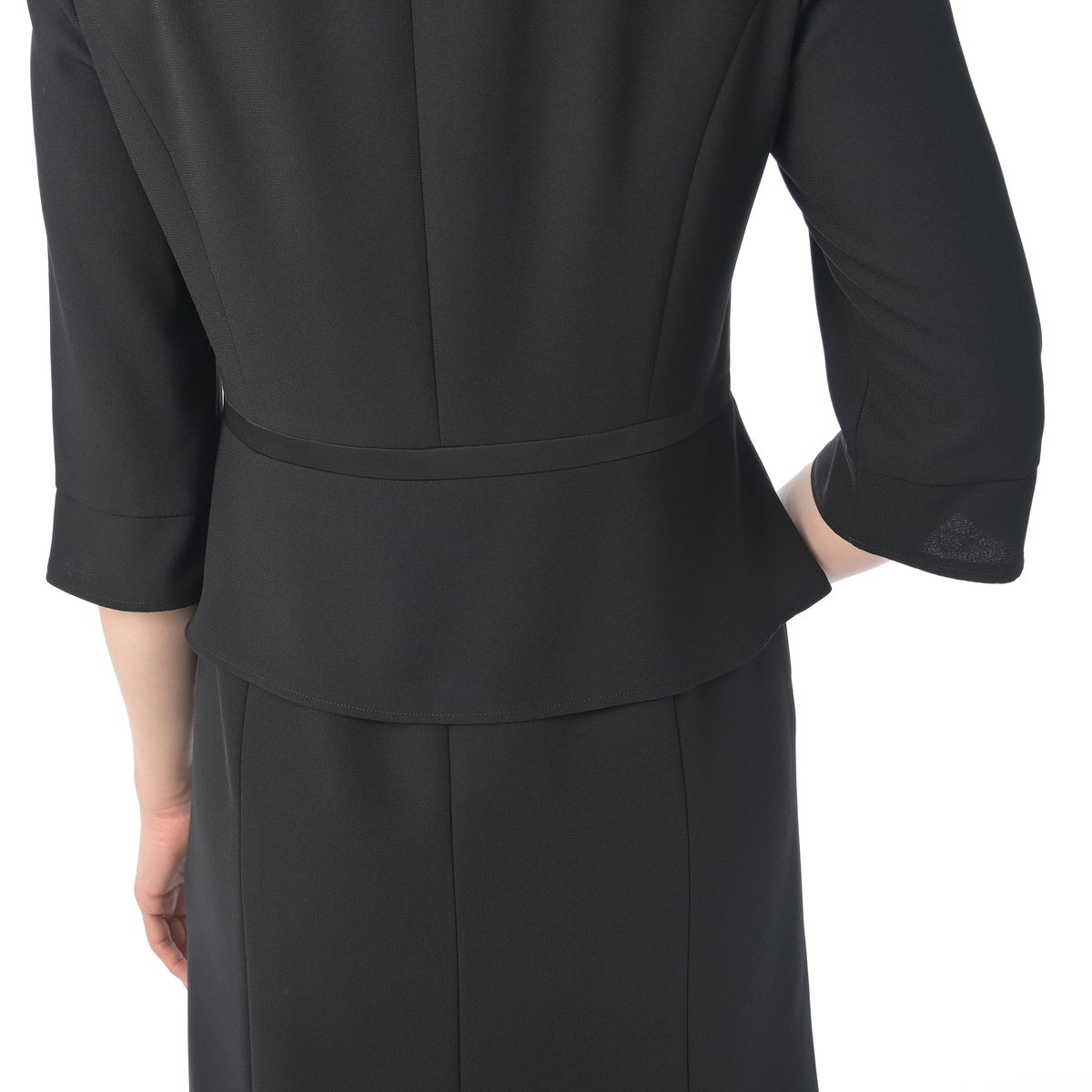2ピース風に見えるデザインは、改まり度が高くキチンと感を演出。さらに窮屈感が少なくエフォートレスなゆったりシルエットです。サテンアクセントがエレガント。スカート部分は下半身をすっきりと包み込むAラインにしています