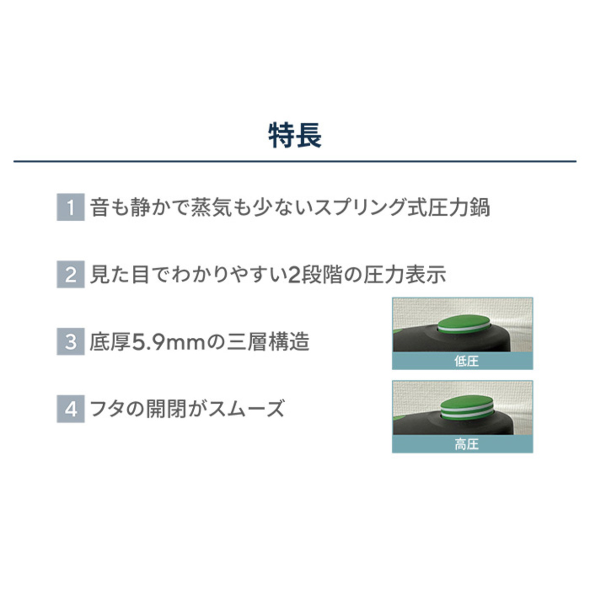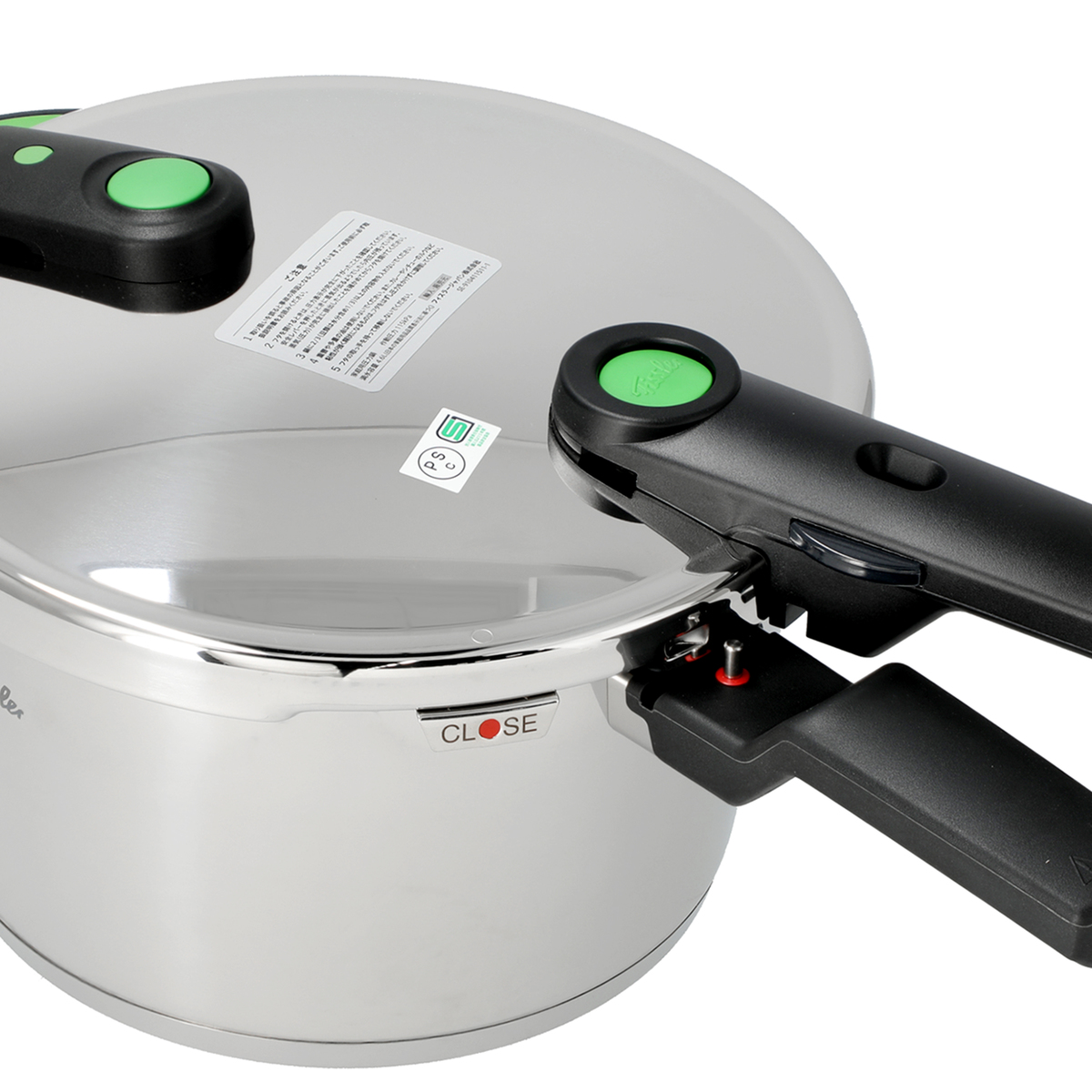 調理中の蒸気が出にくく音も静かな、フィスラーのスプリング式圧力鍋。底厚約5.9mm*のしっかりとした作りで、IHにもガス火にも対応。製品安全協会(SGマーク)、圧力なべ協議会(JPCC)の認証を受けています