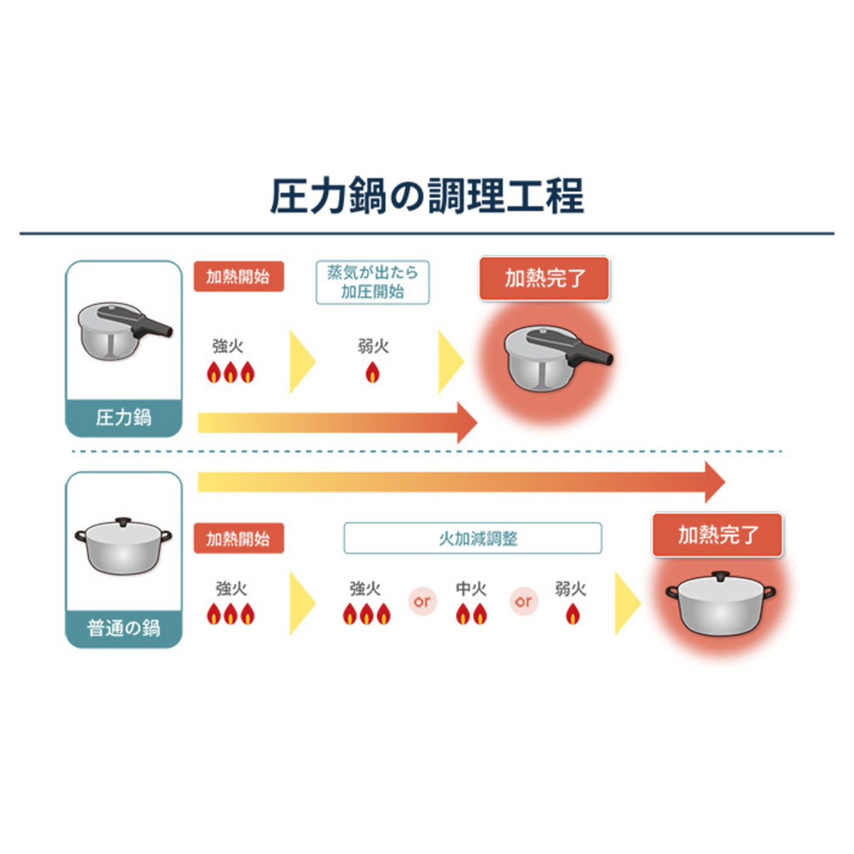 高圧・低圧の2段階設定が可能。低圧(加熱温度約109℃)は、魚など煮崩れしやすい食材の調理やプリン・茶碗蒸しなどに。高圧(加熱温度約117℃)は、シチューなど料理全般にお使いいただけます