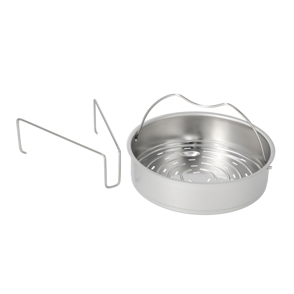 [商品内容] ・本体 ・フタ ・蒸し器 ・三脚 ・レシピブック [サイズ] 奥行42.5×幅25×高さ17.5cm 内径:22cm (鍋底厚5.9mm(はり底を含む)) [重量] 約3050g [満水容量] 4.6L [材質] 本体:ステンレス鋼(クロム18%) はり底:アルミニウム、ステンレス鋼(クロム18%) [使用方法] ・ご使用前に洗ってください ・ご使用の前に取扱い説明書記載の通り、各部を点検してください ・フタをセットします ・フタを閉めます ・安全レバーを確かめます ・強火にかけます ・アロマピーから蒸気が出始めます ・圧力表示が上がり始めます ・圧力表示が白線まで上がったら、火を弱めます ・加圧時間を計ります ・火を止めて蒸らします ・自然放置か急冷し圧力を下げます ・圧力が下がったらフタを開けます [注意事項] ※使用不可:漂白剤、電子レンジ、オーブンレンジ ※使用可:取っ手取外し、食器洗い機 ※調理以外にはご使用にならないでください ※電子レンジでは使用しないでください ※電気、ガス、IH以外の熱源ではご使用にならないでください ※圧力鍋のフタに貼ってあるシールは、はがさないでください ※取っ手がゆるんでいませんか?取っ手がゆるんでいると脱落してやけどの危険があります ※メインバルブ、アロマピー、ゴムパッキンの点検をしてください ※フタが完全にしまり、取っ手の表示が緑になっていることを確認してから加熱してください ※空焚きはしないでください ※お子様の近くで調理をしないでください ※圧力鍋をご使用中にはその場を離れないでください ※取っ手の部分が熱くなる場合があります ※洗浄の際に金属製の固いものは使用しないでください ※ストーブの上で使用しないでください ※ゴムパッキン、シリコンゴムキャップ等のゴム製部品は消耗品です ※鍋に衝撃を与えないでください ※最低カップ1杯(200ml〜300ml)の水を入れて下さい ※重曹や多量の油、カレーやシチューのルゥなどは使わないでください ※調理量を守ってください ※調理中は蒸気をもらさないようにしてください ※炎は鍋底からはみ出さないようにしてください ※蒸気排気口からの蒸気に気をつけて下さい ※フタは圧力を抜いてからあけてください ■IH200V迄・電気調理器 対応可 ■取り扱い説明を充分にご確認の上、ご使用下さい 【ドイツ製】 ※長時間食材を入れたままにしないでください ※圧力をかけての揚げ物はしないでください ※加圧すると膨張する可能性のある素材の調理の際は、やけどにご注意下さい ※加圧中に圧力鍋を動かす際には鍋つかみ等を使用し、やけどにご注意下さい ※圧力鍋をテーブル等の上に置く際には、鍋敷きをご利用ください ※圧力鍋は医療目的で使用しないでください ※圧力鍋を改造しないでください ※フィスラー純正交換部品をお使いください ※圧力鍋本体または部品が破損、変形している場合は使用を中止してください ※部品交換、洗浄の際にケガをしないようご注意下さい ※IH調理器は1400ワット以上の電力の製品をご使用下さい [お手入れ] ・使用後には必ず、速やかに台所用中性洗剤を使って圧力鍋を洗い、汚れを落としてから乾いた布巾でふいて完全に乾かしてください。洗浄用具はスポンジまたはナイロン製ブラシなど、柔らかいものをご使用下さい ・フタからゴムパッキンを取り外し、手で洗います ・メインバルブを取り外し、洗ってください ・必要に応じて(少なくとも汚れが目立つ場合)、フタ用取っ手を取り外し、水で汚れを洗い流してください ・食器洗浄機をご使用の場合は、ゴムパッキン、メインバルブ、フタ用取っ手は取り外してください ・食材の取り残しが鍋についたまま乾燥してしまったり、食材を鍋の中に入れたまま長時間保存したりしないようにご注意ください。ステンレススチールに汚れが残り、表面が変色・変質するおそれがあります