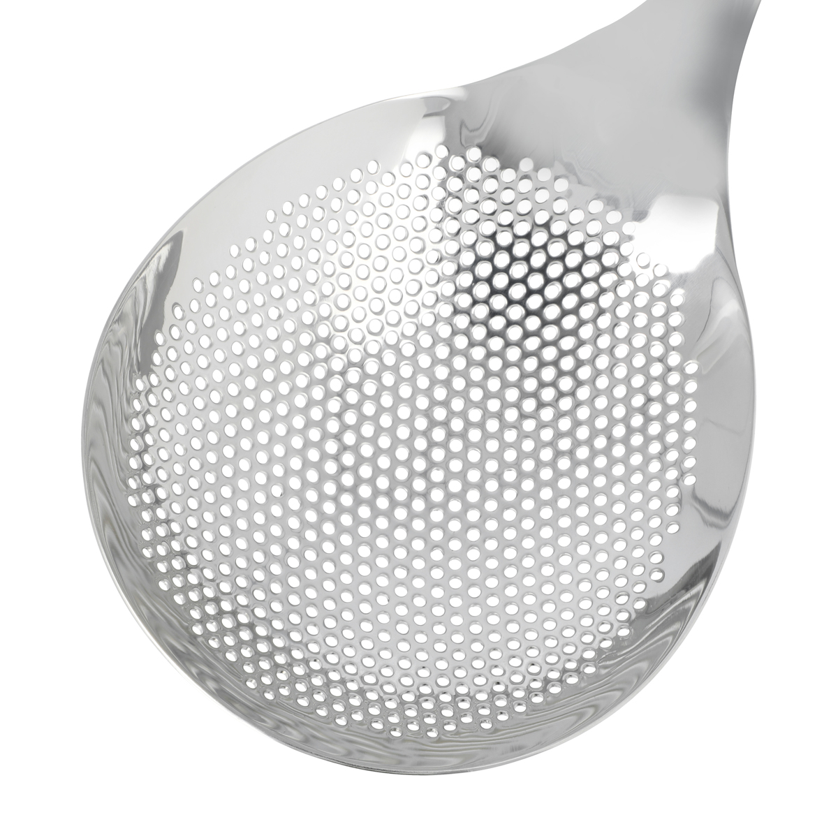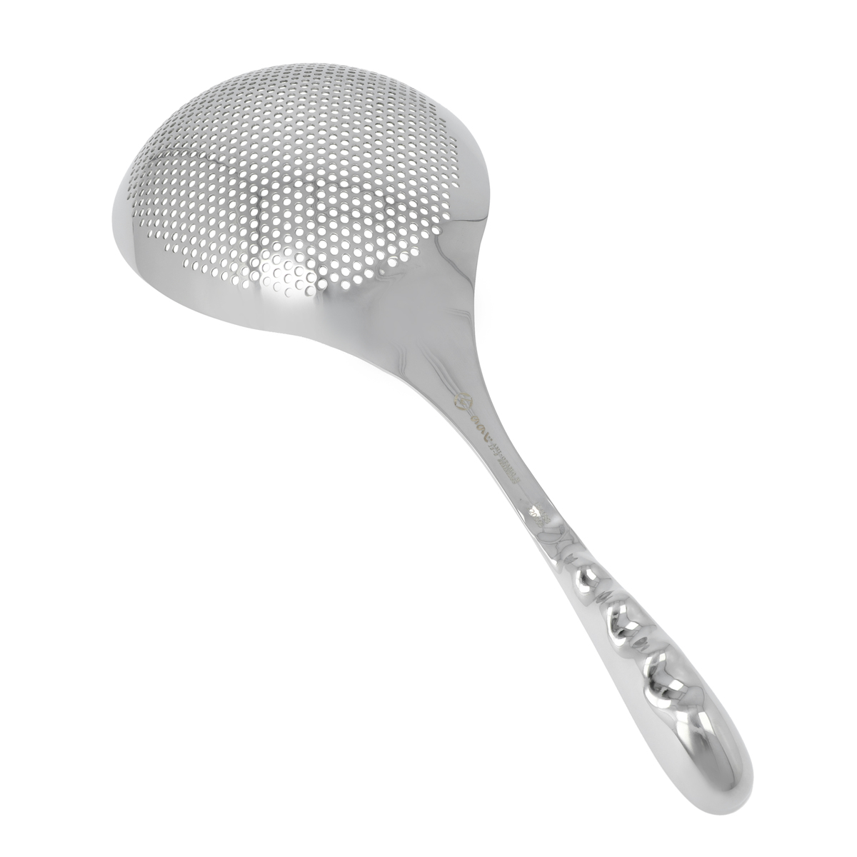 中空で軽く、手首の返しが安定するユニバーサルデザイン設計。操作性を追求したシェルグリップで、大きな手でも小さな手でも握りやすいデザインです。777個の穴があり、ラーメンひと玉もラクラクすくえて、横持ちできるので、手首の返しだけで水きりができます