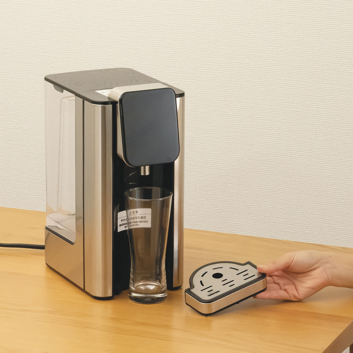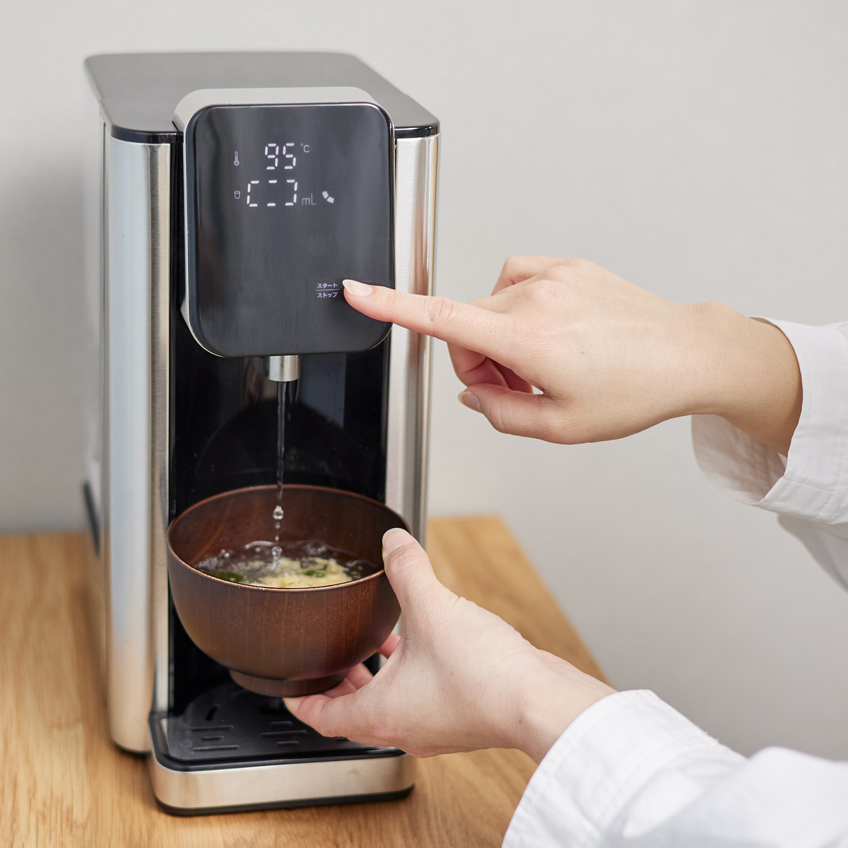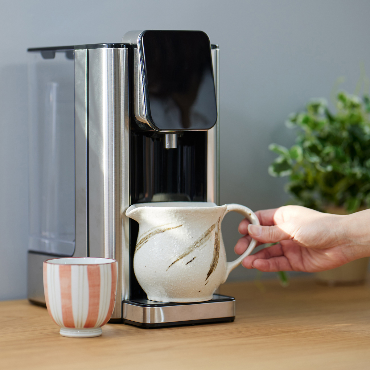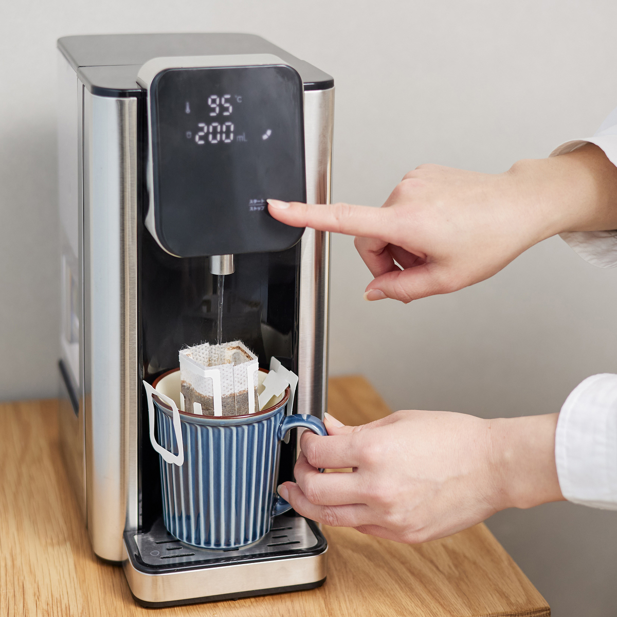 約幅15.0×奥行27.0×高さ31.5cmのコンパクトサイズ。台座を取り外すとノズル(給水口)までの高さは約18cmで、背の高いコップやタンブラーにも直接給水が可能です。操作・表示部はフルフラットのデジタルタッチパネルを採用。お湯の温度は85℃、95℃。給湯量は200ml、300ml、400ml、500mlまたは連続給湯から選択することができます