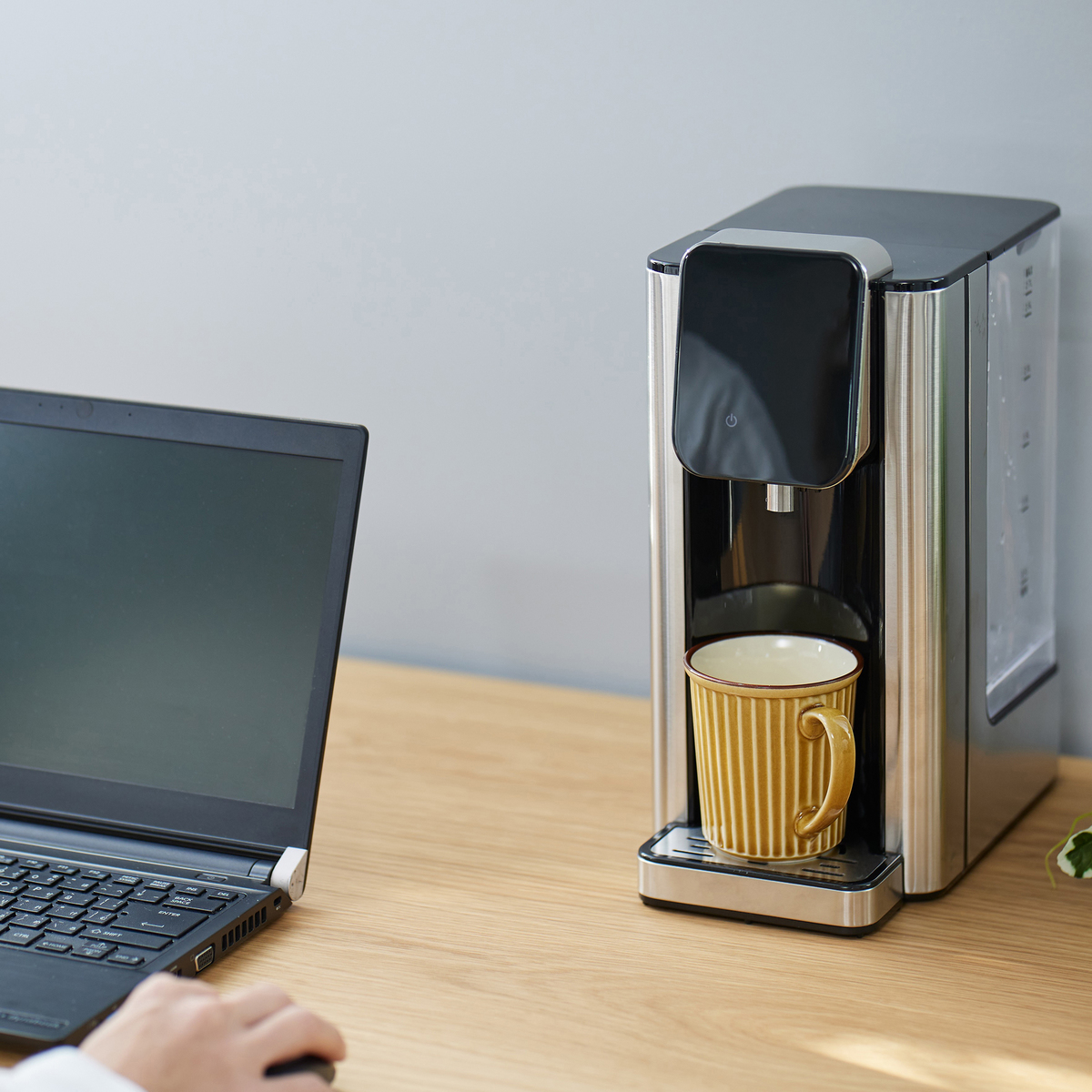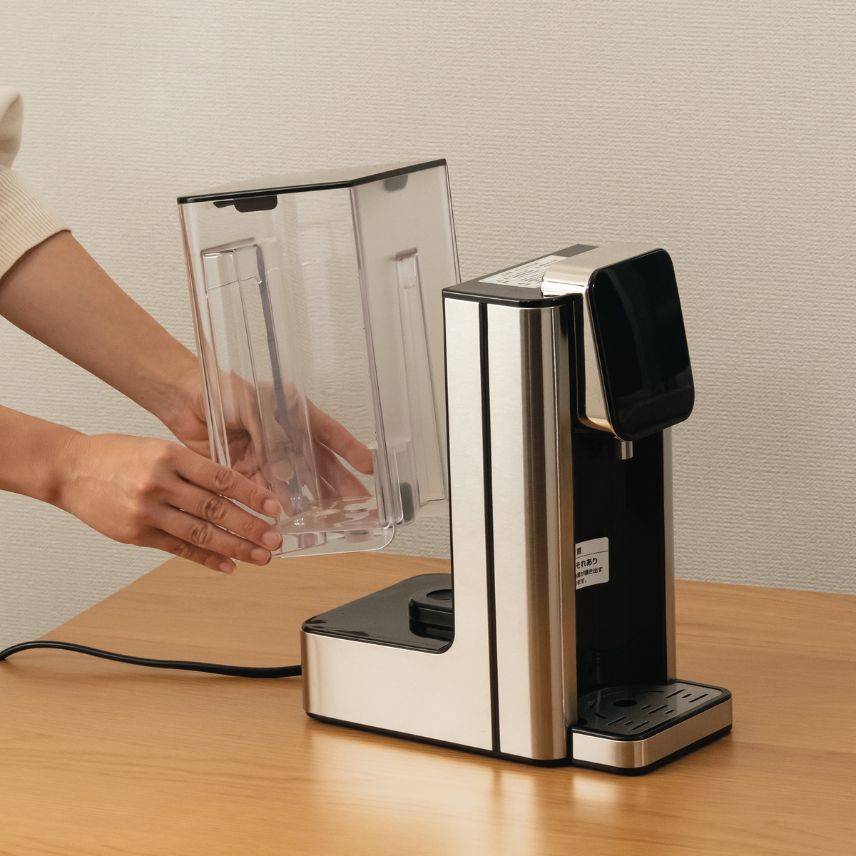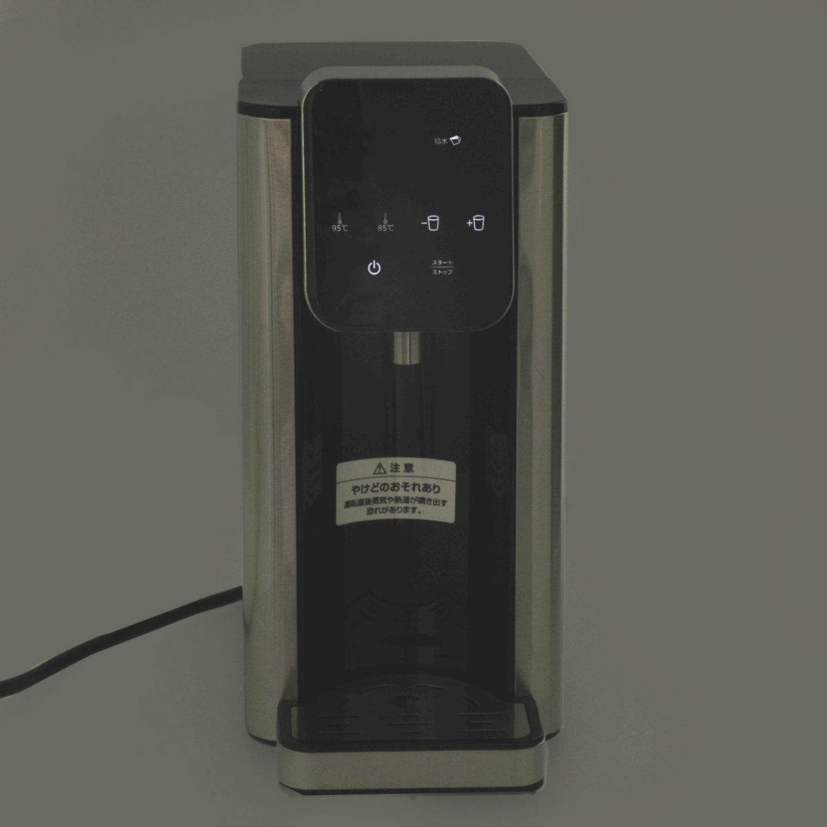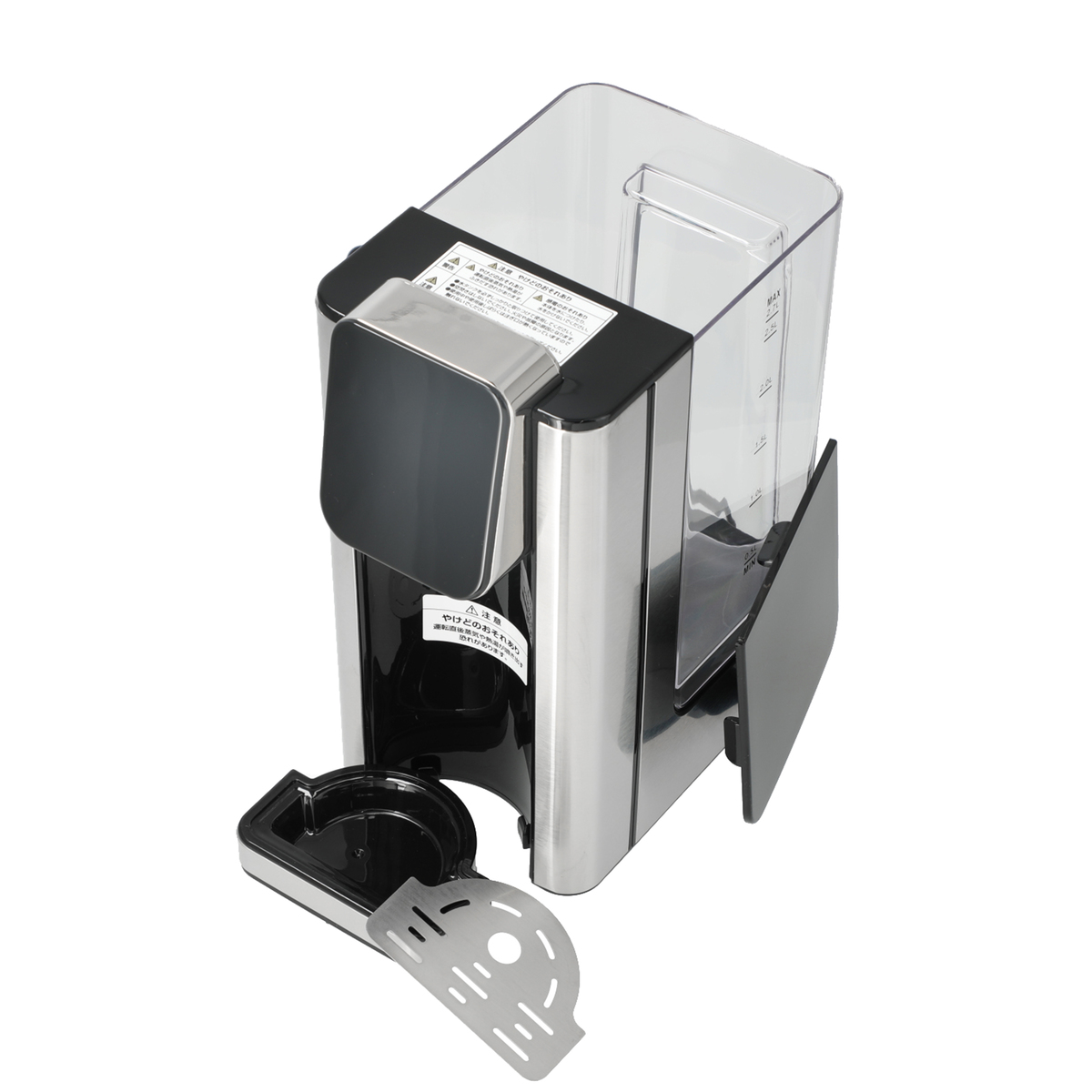 約幅15.0×奥行27.0×高さ31.5cmのコンパクトサイズ。台座を取り外すとノズル(給水口)までの高さは約18cmで、背の高いコップやタンブラーにも直接給水が可能です。操作・表示部はフルフラットのデジタルタッチパネルを採用。お湯の温度は85℃、95℃。給湯量は200ml、300ml、400ml、500mlまたは連続給湯から選択することができます