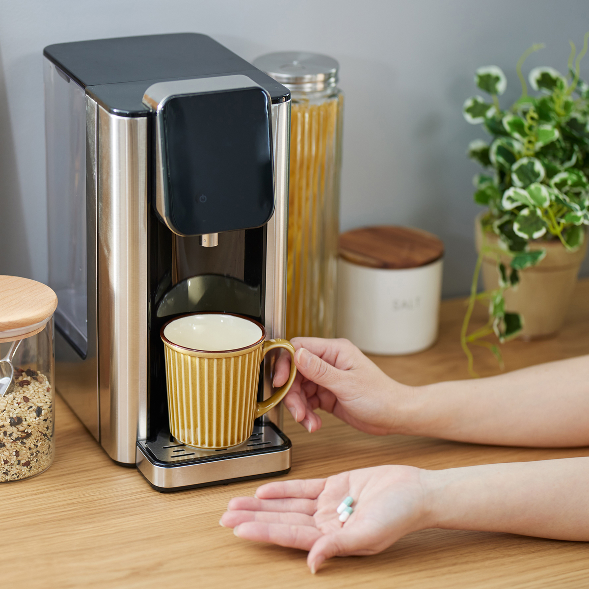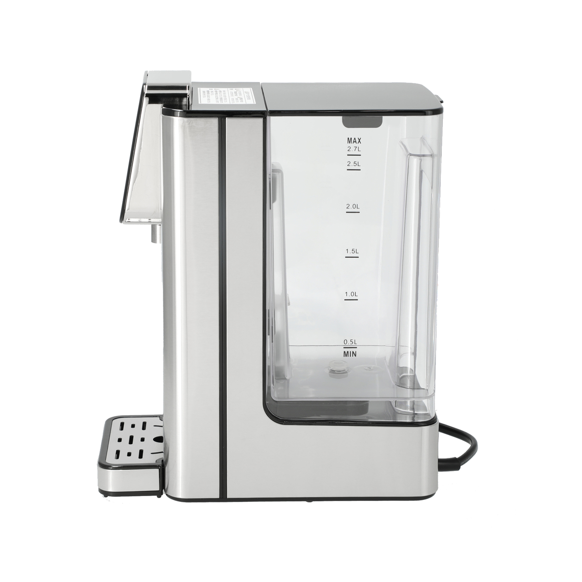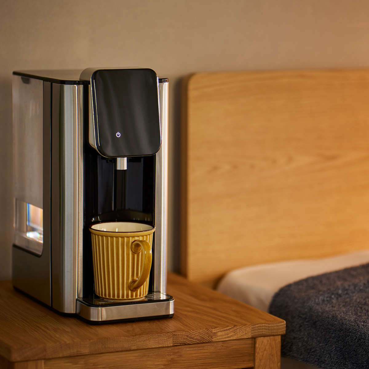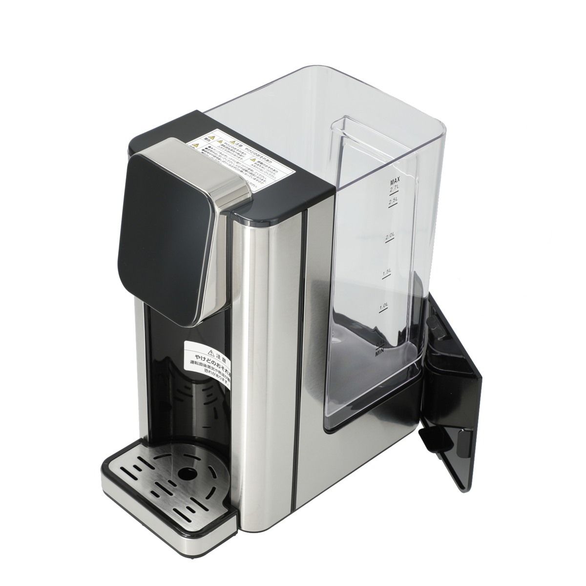 約幅15.0×奥行27.0×高さ31.5cmのコンパクトサイズ。台座を取り外すとノズル(給水口)までの高さは約18cmで、背の高いコップやタンブラーにも直接給水が可能です。操作・表示部はフルフラットのデジタルタッチパネルを採用。お湯の温度は85℃、95℃。給湯量は200ml、300ml、400ml、500mlまたは連続給湯から選択することができます