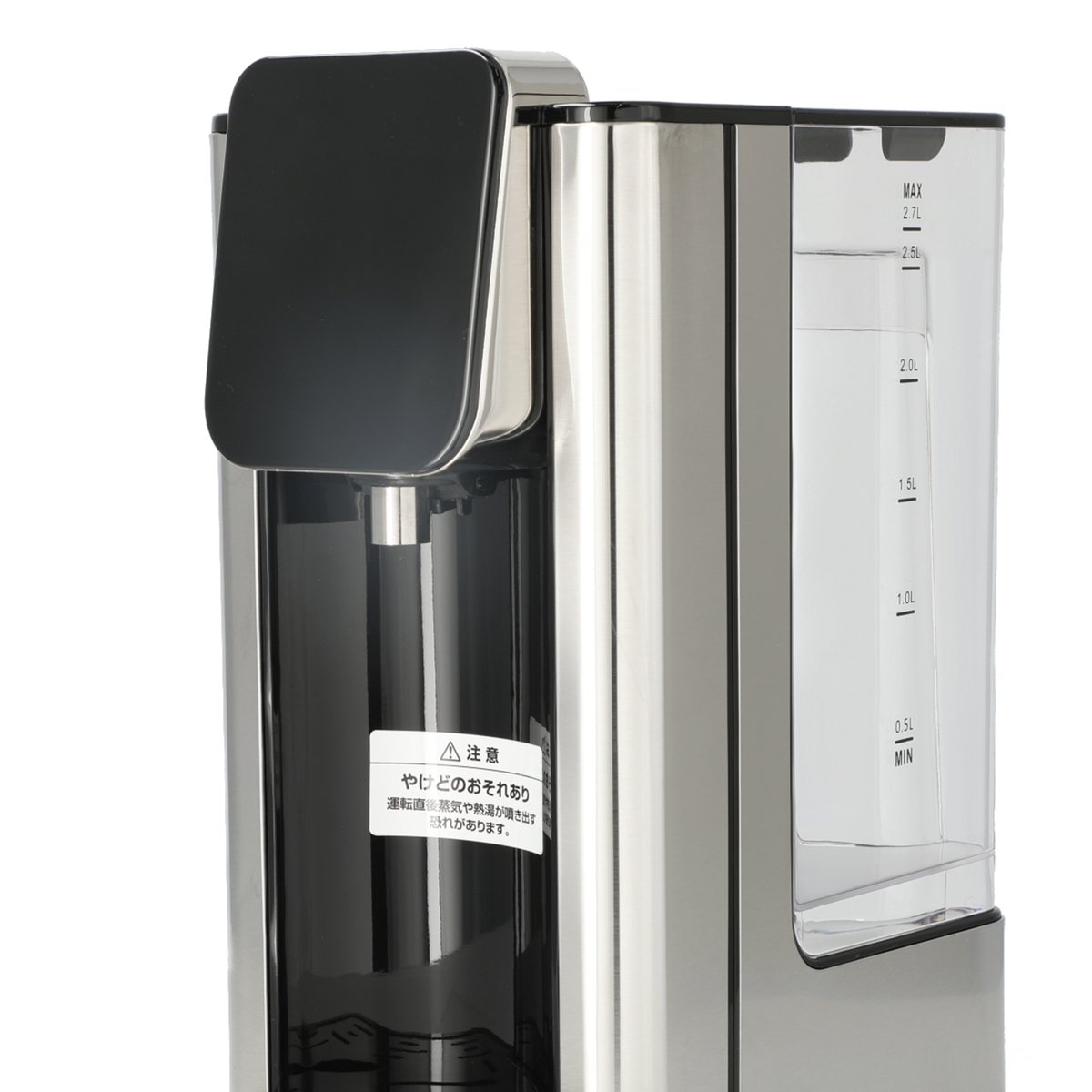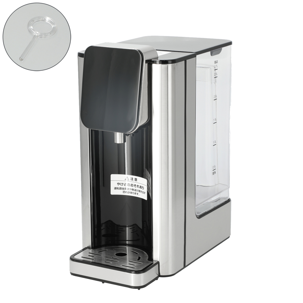 [商品内容] ・本体 ・台座プレート ・台座 ・リセットピン [サイズ] 約幅15.0×奥行27.0×高さ31.5cm [重量]約2.2kg [湯沸かし容量]2.7L [コード長さ]約1.5m [消費電力]1300W [注意事項] ※分解・修理・改造はしない ※子供だけで使わせたり乳幼児の手の届くところで使わない ※濡れた手で電源プラグを抜き差ししない ※コンセントや配線器具の定格を超えて使用したり交流100V以外で使用したりしない ※使用中や使用後しばらくは操作・表示部以外に触れない ※定格15A以上のコンセントを単独で使う ※使用中や使用後しばらくは給湯口に顔や手を近づけない(特に乳幼児には触らせないよう注意する) ※給湯口をふさがない ※電源プラグはコンセントの奥までしっかり確実に差し込む ※電源プラグを乳幼児が誤ってなめないようにする ※電源プラグの刃および刃の取付面にホコリが付着している場合は拭き取る ※電源コードを傷付けたり、無理に曲げたり、引っ張ったり、ねじったり、束ねたり、高温部に近づけたり、重い物を載せたり、挟み込んだり、加工したりしない ※電源コードや電源プラグが傷んだり、コンセントの差し込みが緩いときは使用しない ※タンクに満水表示以上の水を入れない ※本体をベンジン・シンナーで拭いたりしない ※異常・故障時には、直ちに使用を中止する ※本体を水につけたり、水をかけたりしない ※長期間使用しないときは必ず電源プラグをコンセントから抜く ※お手入れの際は、電源プラグをコンセントから抜く ※使用中に本体を持ち上げたり、ゆすったり、傾けたり、移動したりしない ※落下させるなどにより本体に損傷がある場合は使用しない ※取扱説明書に記載した用途以外には使用しない ※子供や介護の必要な方だけでは使わない、また子供に遊ばせない ※壁や家具の近くで使用しない ※不安定な場所で使用しない ※熱に弱いテーブルクロスや敷物の上で使用しない ※すき間に金属物(ピンや針金など)などの異物を入れない ※電源コードが破損した場合、電源コードの交換はしない ※使用時以外は電源プラグをコンセントから抜く ※電源プラグを抜くときは、電源コードを持たずに先端の電源プラグを持って引き抜く ■取り扱い説明を充分にご確認の上、ご使用下さい 【中国製】 ※タンクに水以外のものを入れて使用しない ※水のかかるところや火気の近くでは使用しない ※本体の上に物を載せない ※器具用プラグにピンやごみを付着させない ※使用中や給湯中は本体から離れない ※屋外では使用しない ※本体を転倒させない ※家具や壁、他の電気機器に蒸気があたるところで使用しない ※熱湯に注意する ※お手入れは本体が冷めてから行う ※初めてお使いになる際は本体内部を洗浄してから使用ください ※水道水の使用をおすすめします ※使用に伴い、給湯口などに白色の斑点が付着する場合があります。これは、沸とうの際に水のミネラル成分が結晶化したもの(スケール)で、有害ではありません