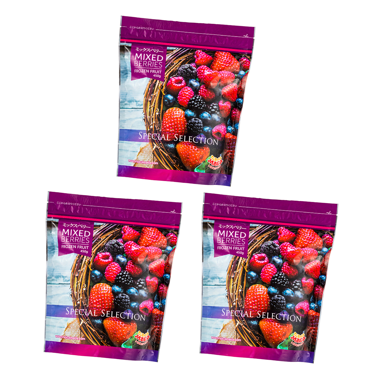 [アレルギー物質特定原材料8品目] なし [内容量] 450g×3袋 [賞味期限] 出荷時点で賞味期限まで240日以上ある商品をお届けします [保存方法] 開封前:冷凍庫(ー18℃以下)にて保存してください 開封後:開封後はお早めにお召し上がりください [お召し上がり方] 冷蔵庫または常温で半解凍し、そのままお召し上がりください [注意事項] ※再凍結しますと、味・品質・鮮度が落ちますのでご注意ください ※解凍後は、すぐにお召し上がりください(目安として解凍後1時間) ※冷蔵庫内に保存すると、庫内の匂いが付着する恐れがございますのでご注意ください [加工地] チリ [原材料] ストロベリー、ブラックベリー、ブルーベリー、ラズベリー