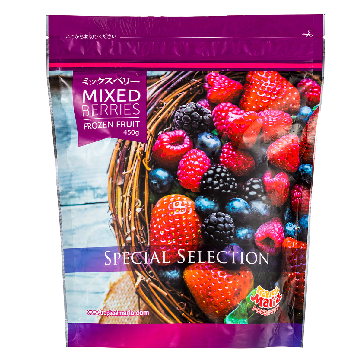 チリ産のベリー4種類(ブルーベリー、ラズベリー、ブラックベリー、ストロベリー)をミックスしました。4種のベリーはカットせず、ホールのまま製品化。チャック付き袋入りのバラ凍結なのでお好きな分だけお使いいただけます