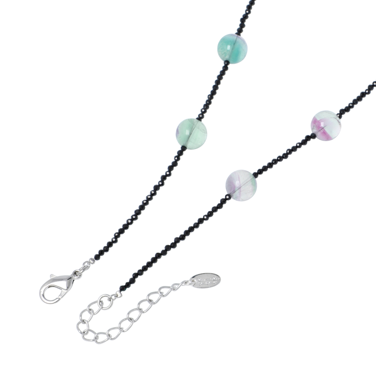 色とりどりのフローライトと、美しいカットを施したブラックスピネルを組合せたネックレス&イヤリングまたはピアスのセットです。多彩なカラーでありながらも落ち着いた色合いのフローライトは、ブラックスピネルと相性ぴったり。どんなお洋服にも上品に馴染みます