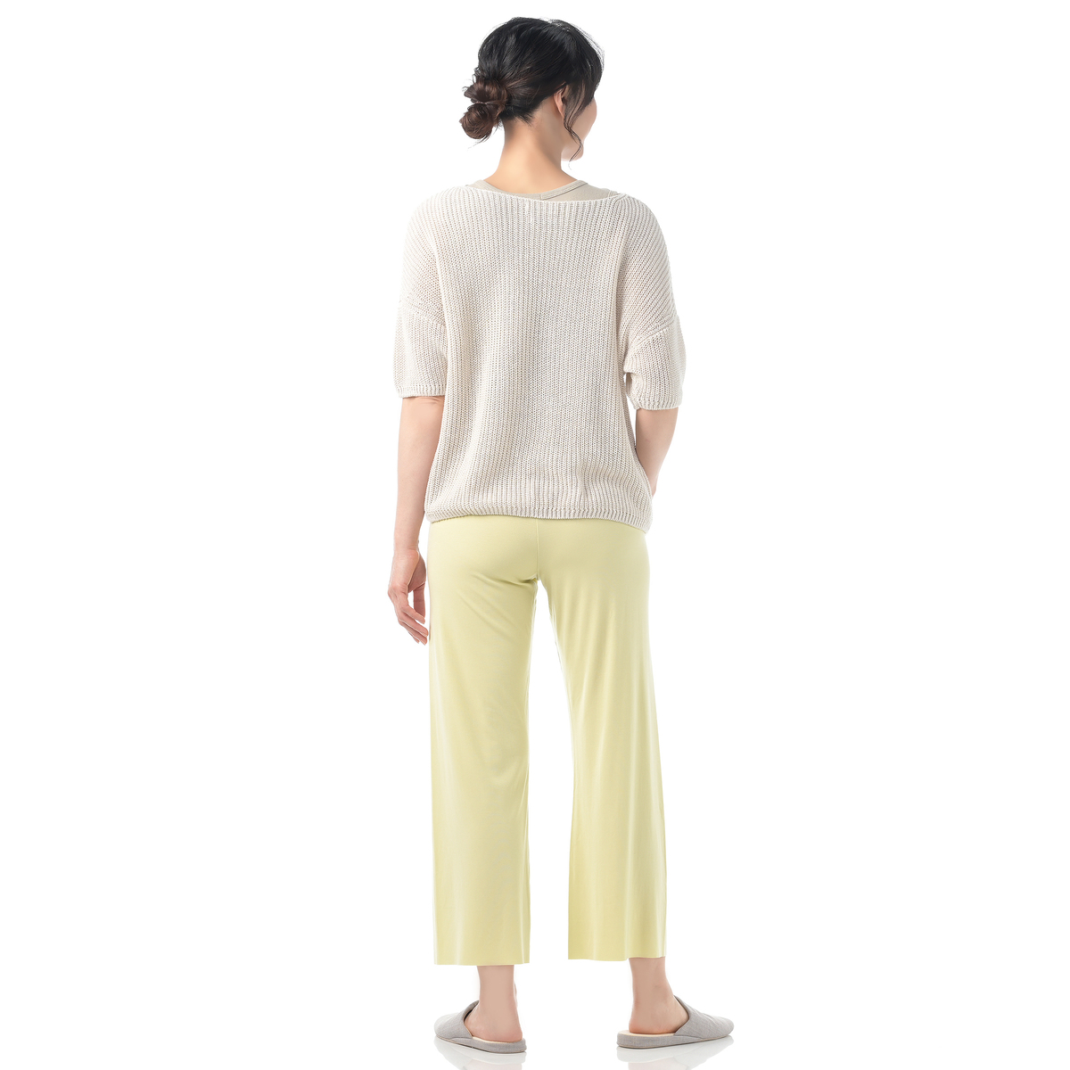 柔らかな風合いのテンセルモダールを使用したボトムです。ウエストはゴムを使用せず折り返しの仕様に。生地のストレッチ性でフィットするため、締め付け感がなく、やわらかな穿き心地です。穿き込みは深めの設計に。裾は切りっぱなしにして、縫い目によるゴロつきを軽減。ホホバオイル加工も施しています