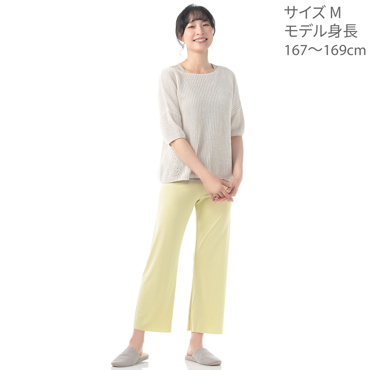 [商品寸法(ヌード寸法)cm] サイズ ウエスト ヒップ 股下 M:60(64〜70) (87〜95) 60 L:64(69〜77) (92〜100) 61 [素材] レーヨン90%、ポリウレタン10% [お手入れ] 洗濯機洗い可 [注意事項] ※取扱い表示記号を参考にして、お洗濯してください ※濃色物と白物との同時洗濯は、色移り、ケバ付着の原因となりますのでお避けください ※白物と色物とのつけおきは避け、洗濯後は速やかに形を整えて干してください ※この製品の生地端は特殊加工でほつれにくい仕上げになっていますが、生地端を強く引っ張るとほつれた状態になることがあります。特に着脱の際には、ご注意ください 【日本製】