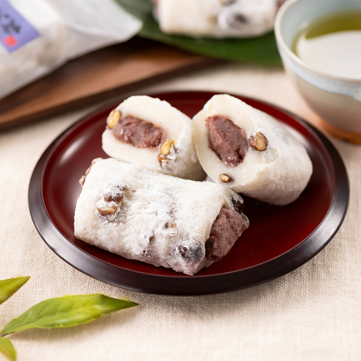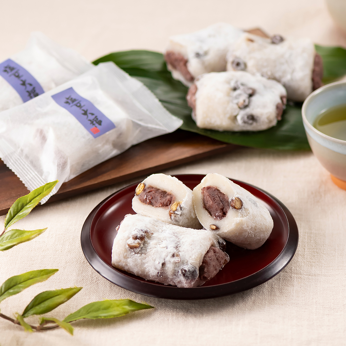 国産のもち米粉でコシのあるお餅に。伊豆大島で製造した「海の精」を入れ、程よい塩加減にしています。餅に国産赤えんどう豆のシラップ漬けを入れ、噛むごとに赤えんどう豆の甘さが際立つ味わい深い塩豆餅に。筒状に包餡し、どこから食べても餡が味わえることを目指した、食べやすい形状に仕上げています