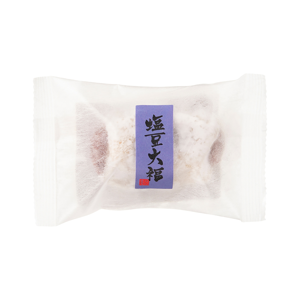 素材が調和した絶妙な味わいの塩豆大福です。程よい塩味の餅生地に甘ゆでえんどう豆を練り込み、自家製粒餡を入れました。できあがった塩豆大福を美味しい状態のまま冷凍。室温で2〜3時間解凍するだけで、できたてのような美味しさをお楽しみいただけます