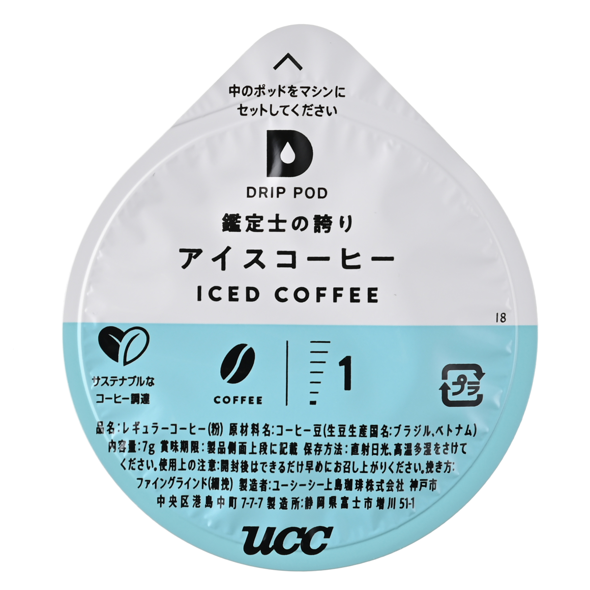 UCC富士工場で製造された「UCC ドリップポッド カプセル」のアイスコーヒーです。カプセル上部のスペースで蒸らしができ、ドリップらしいクリアな味わいが抽出できる構造になっています